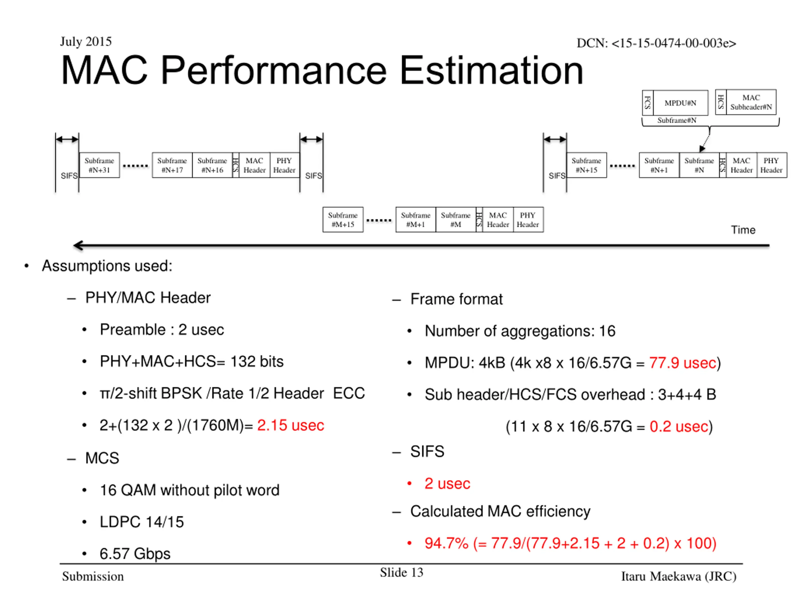 July 2015 MAC Performance Estimation DCN: <15-15-0474-00-003e> MAC HCS FCS MPDU#N Subheader#N Subframe#N Subframe #N+31 Subframe #N+17 Subframe #N+16 MAC Header PHY Header Subframe #N+15 Subframe #N+1 Subframe #N MAC Header PHY Header HCS HCS SIFS SIFS SIFS Subframe #M+15 Subframe #M+1 Subframe #M MAC Header PHY Header HCS Time Assumptions used: PHY/MAC Header Frame format Preamble : 2 usec Number of aggregations: 16 PHY+MAC+HCS= 132 bits MPDU: 4kB (4k x8 x 16/6.57G = 77.9 usec) /2-shift BPSK /Rate 1/2 Header ECC Sub header/HCS/FCS overhead : 3+4+4 B 2+(132 x 2 )/(1760M)= 2.15 usec (11 x 8 x 16/6.57G = 0.2 usec) SIFS MCS 2 usec 16 QAM without pilot word Calculated MAC efficiency LDPC 14/15 94.7% (= 77.9/(77.9+2.15 + 2 + 0.2) x 100) 6.57 Gbps Slide 13 Submission Itaru Maekawa (JRC)