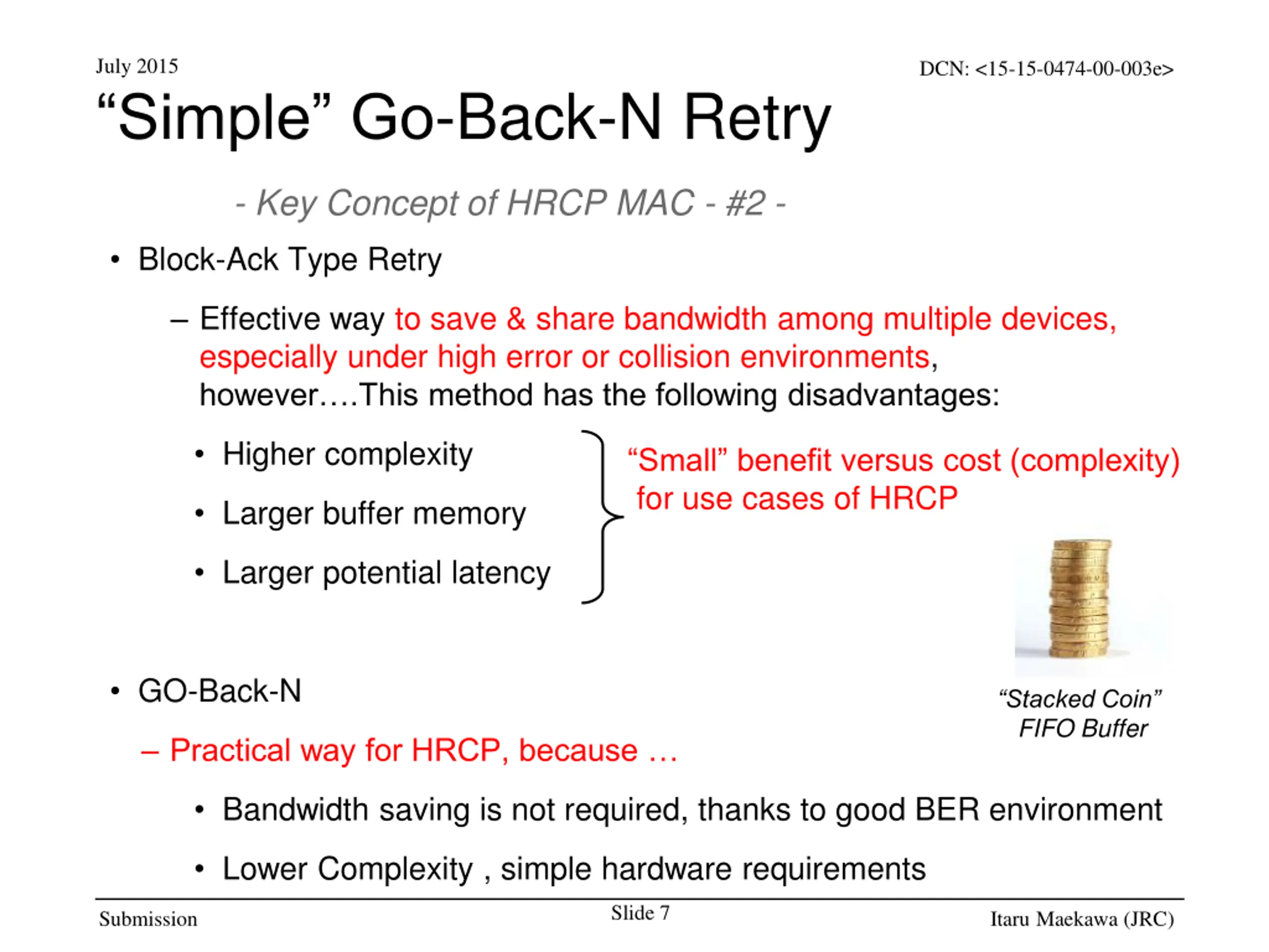 July 2015 Simple Go-Back-N Retry DCN: <15-15-0474-00-003e> - Key Concept of HRCP MAC - #2 - Block-Ack Type Retry Effective way to save & share bandwidth among multiple devices, especially under high error or collision environments, however .This method has the following disadvantages: Higher complexity Small benefit versus cost (complexity) for use cases of HRCP Larger buffer memory Larger potential latency GO-Back-N Stacked Coin FIFO Buffer Practical way for HRCP, because Bandwidth saving is not required, thanks to good BER environment Lower Complexity , simple hardware requirements Slide 7 Submission Itaru Maekawa (JRC)