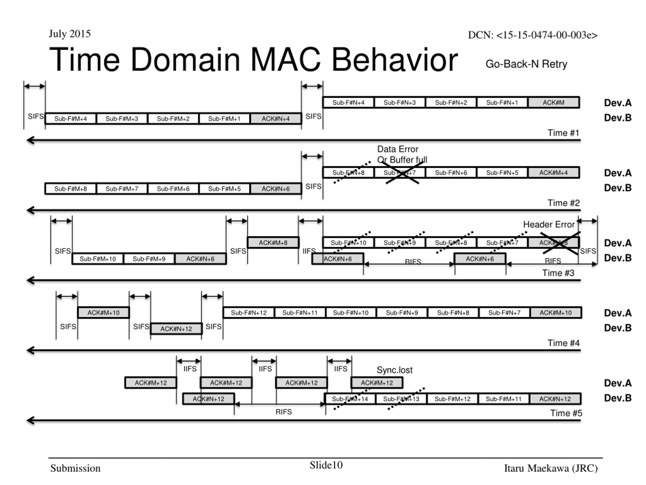 July 2015 Time Domain MAC Behavior DCN: <15-15-0474-00-003e> Go-Back-N Retry Dev.A Dev.B Sub-F#N+4 Sub-F#N+3 Sub-F#N+2 Sub-F#N+1 ACK#M SIFS SIFS Sub-F#M+4 Sub-F#M+3 Sub-F#M+2 Sub-F#M+1 ACK#N+4 Time #1 Data Error Or Buffer full Dev.A Dev.B Sub-F#N+8 Sub-F#N+7 Sub-F#N+6 Sub-F#N+5 ACK#M+4 SIFS Sub-F#M+8 Sub-F#M+7 Sub-F#M+6 Sub-F#M+5 ACK#N+6 Time #2 Header Error Dev.A Dev.B ACK#M+8 Sub-F#N+10 Sub-F#N+9 Sub-F#N+8 Sub-F#N+7 ACK#M+8 SIFS SIFS IIFS SIFS Sub-F#M+10 Sub-F#M+9 ACK#N+6 ACK#N+6 ACK#N+6 RIFS RIFS Time #3 Dev.A Dev.B ACK#M+10 Sub-F#N+12 Sub-F#N+11 Sub-F#N+10 Sub-F#N+9 Sub-F#N+8 Sub-F#N+7 ACK#M+10 SIFS SIFS SIFS ACK#N+12 Time #4 IIFS IIFS IIFS Sync.lost Dev.A Dev.B ACK#M+12 ACK#M+12 ACK#M+12 ACK#M+12 ACK#N+12 Sub-F#M+14 Sub-F#M+13 Sub-F#M+12 Sub-F#M+11 ACK#N+12 RIFS Time #5 Slide10 Submission Itaru Maekawa (JRC)