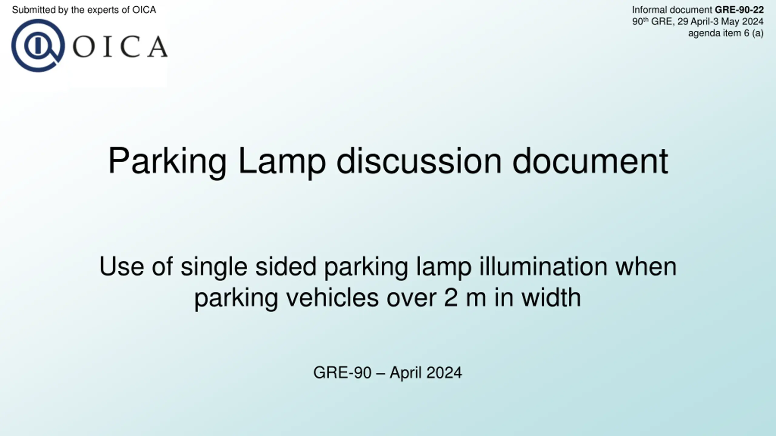 Submitted by the experts of OICA Informal document GRE-90-22 90thGRE, 29 April-3 May 2024 agenda item 6 (a) Parking Lamp discussion document Use of single sided parking lamp illumination when parking vehicles over 2 m in width GRE-90 April 2024