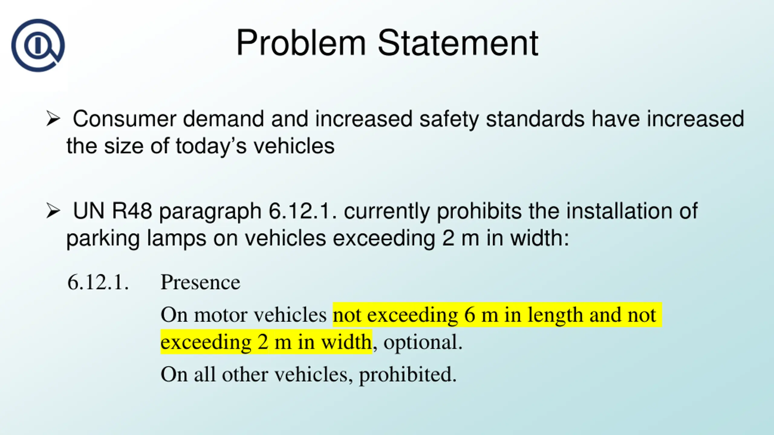 Problem Statement Consumer demand and increased safety standards have increased the size of today s vehicles UN R48 paragraph 6.12.1. currently prohibits the installation of parking lamps on vehicles exceeding 2 m in width: 6.12.1. Presence On motor vehicles not exceeding 6 m in length and not exceeding 2 m in width, optional. On all other vehicles, prohibited.