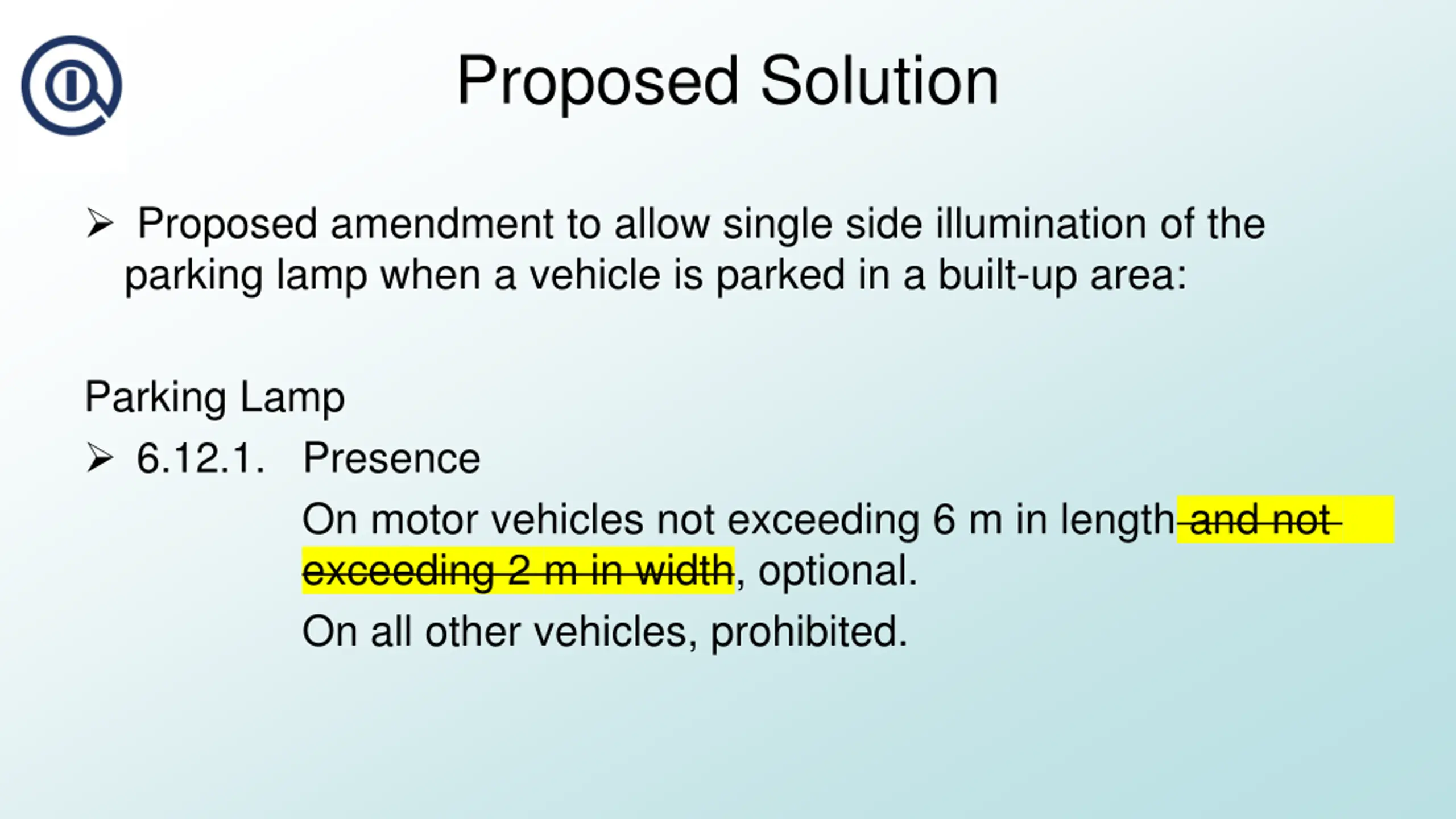 Proposed Solution Proposed amendment to allow single side illumination of the parking lamp when a vehicle is parked in a built-up area: Parking Lamp 6.12.1. Presence On motor vehicles not exceeding 6 m in length and not exceeding 2 m in width, optional. On all other vehicles, prohibited.
