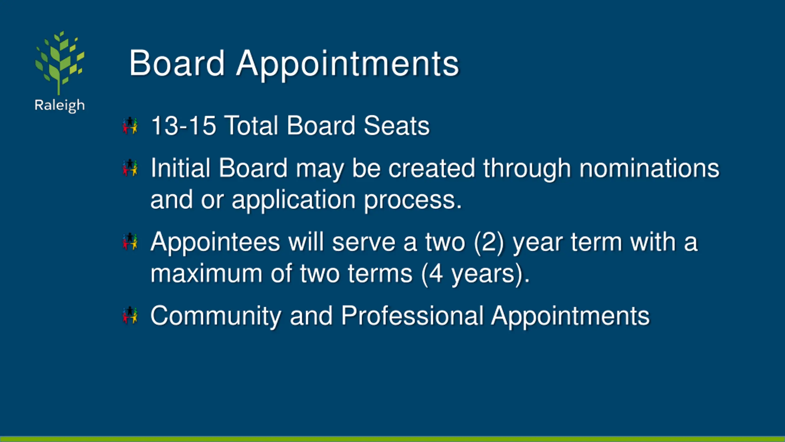 Board Appointments 13-15 Total Board Seats Initial Board may be created through nominations and or application process. Appointees will serve a two (2) year term with a maximum of two terms (4 years). Community and Professional Appointments