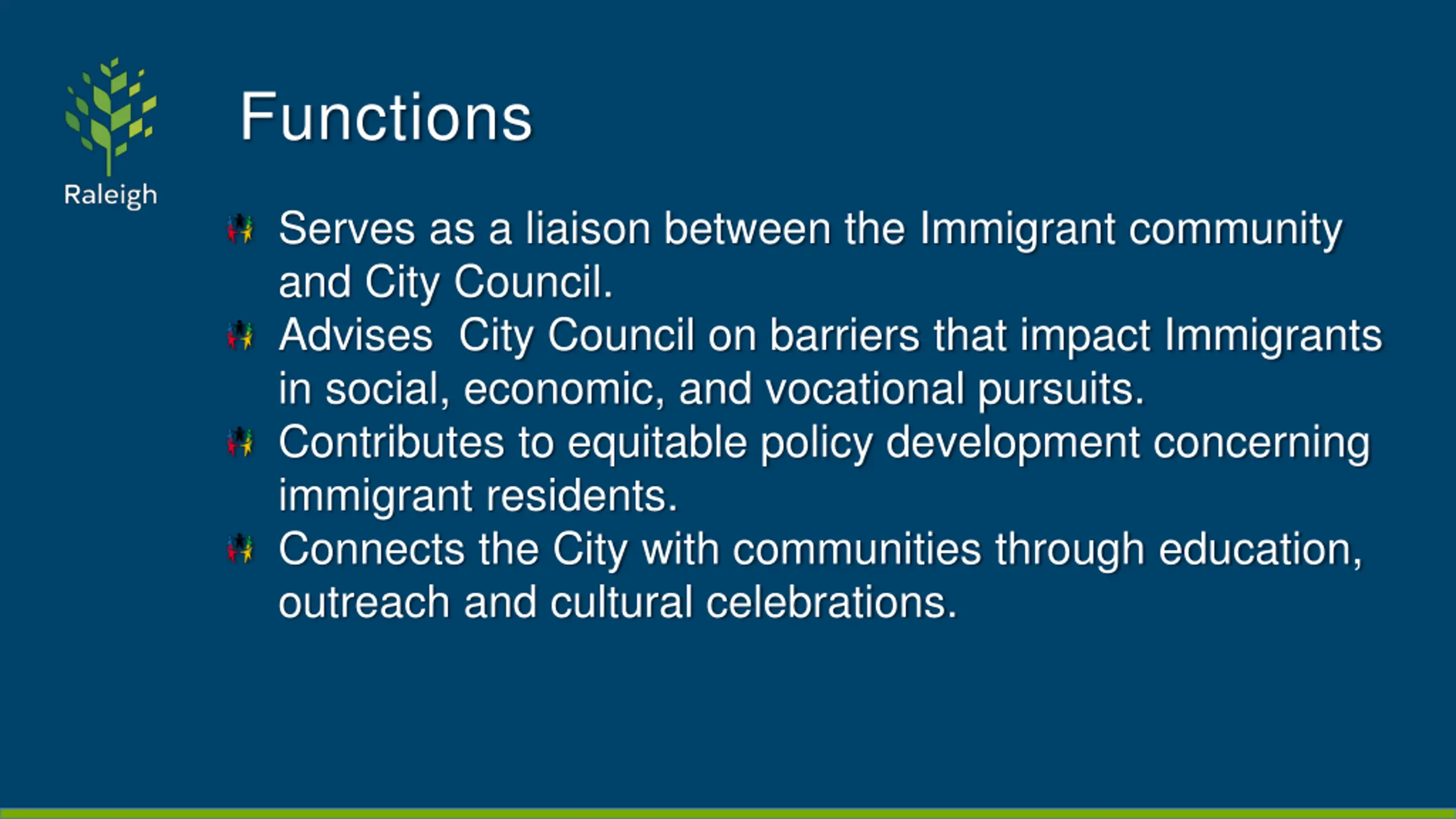 Functions Serves as a liaison between the Immigrant community and City Council. Advises City Council on barriers that impact Immigrants in social, economic, and vocational pursuits. Contributes to equitable policy development concerning immigrant residents. Connects the City with communities through education, outreach and cultural celebrations.
