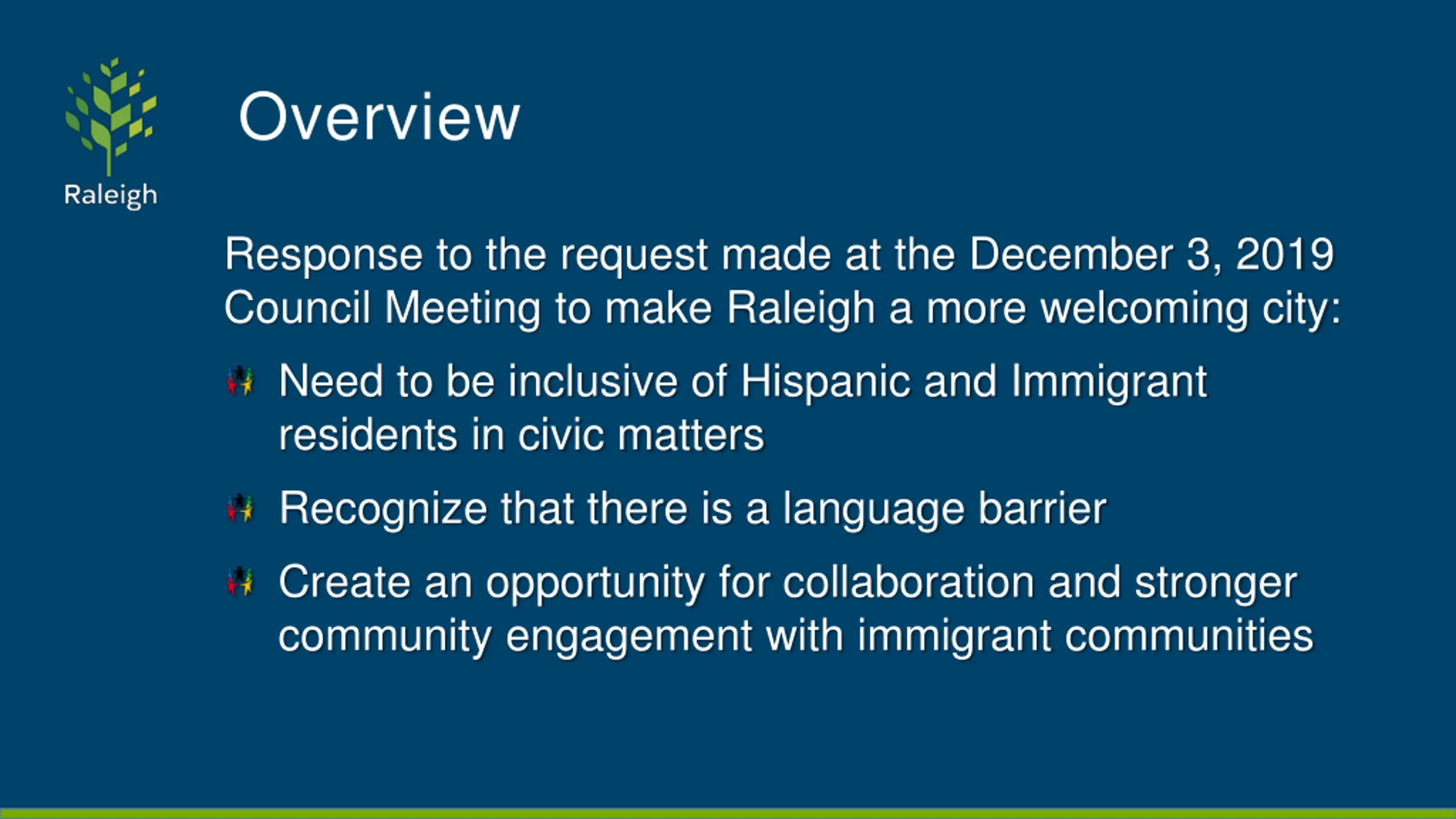 Overview Response to the request made at the December 3, 2019 Council Meeting to make Raleigh a more welcoming city: Need to be inclusive of Hispanic and Immigrant residents in civic matters Recognize that there is a language barrier Create an opportunity for collaboration and stronger community engagement with immigrant communities
