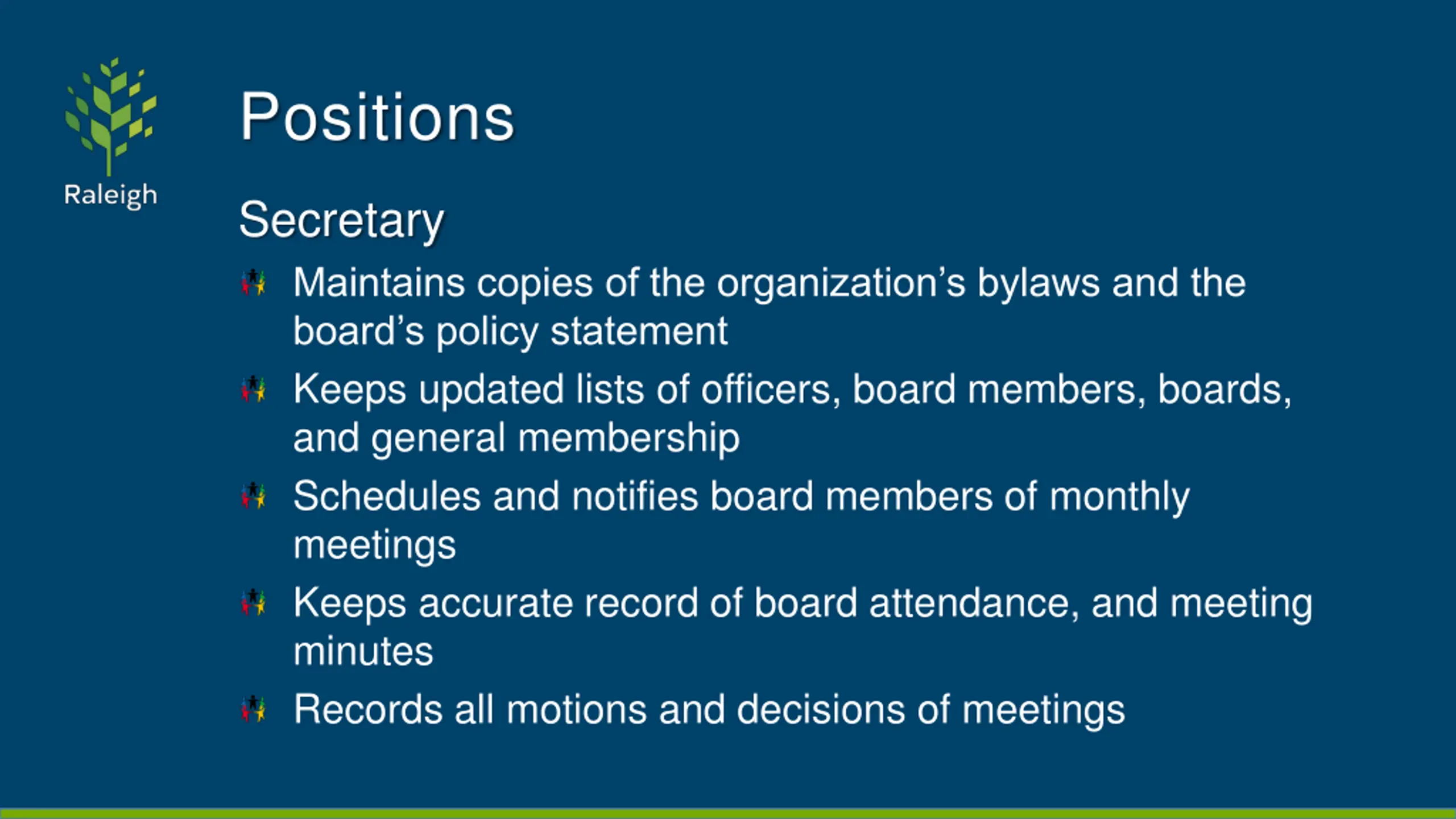 Positions Secretary Maintains copies of the organization s bylaws and the board s policy statement Keeps updated lists of officers, board members, boards, and general membership Schedules and notifies board members of monthly meetings Keeps accurate record of board attendance, and meeting minutes Records all motions and decisions of meetings