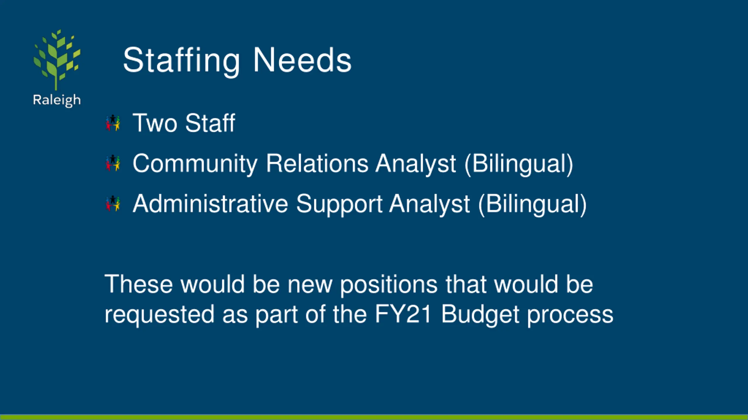 Staffing Needs Two Staff Community Relations Analyst (Bilingual) Administrative Support Analyst (Bilingual) These would be new positions that would be requested as part of the FY21 Budget process