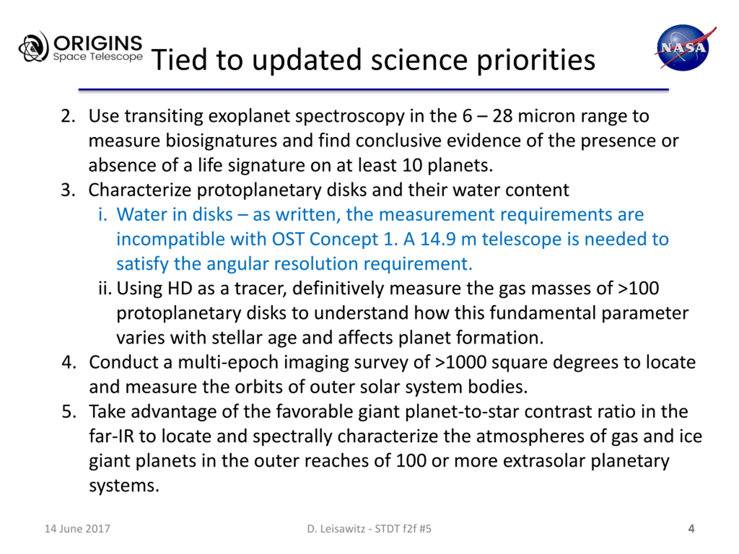 Tied to updated science priorities 2. Use transiting exoplanet spectroscopy in the 6 28 micron range to measure biosignatures and find conclusive evidence of the presence or absence of a life signature on at least 10 planets. 3. Characterize protoplanetary disks and their water content i. Water in disks as written, the measurement requirements are incompatible with OST Concept 1. A 14.9 m telescope is needed to satisfy the angular resolution requirement. ii.Using HD as a tracer, definitively measure the gas masses of >100 protoplanetary disks to understand how this fundamental parameter varies with stellar age and affects planet formation. 4. Conduct a multi-epoch imaging survey of >1000 square degrees to locate and measure the orbits of outer solar system bodies. 5. Take advantage of the favorable giant planet-to-star contrast ratio in the far-IR to locate and spectrally characterize the atmospheres of gas and ice giant planets in the outer reaches of 100 or more extrasolar planetary systems. 14 June 2017 D. Leisawitz - STDT f2f #5 4 4 4