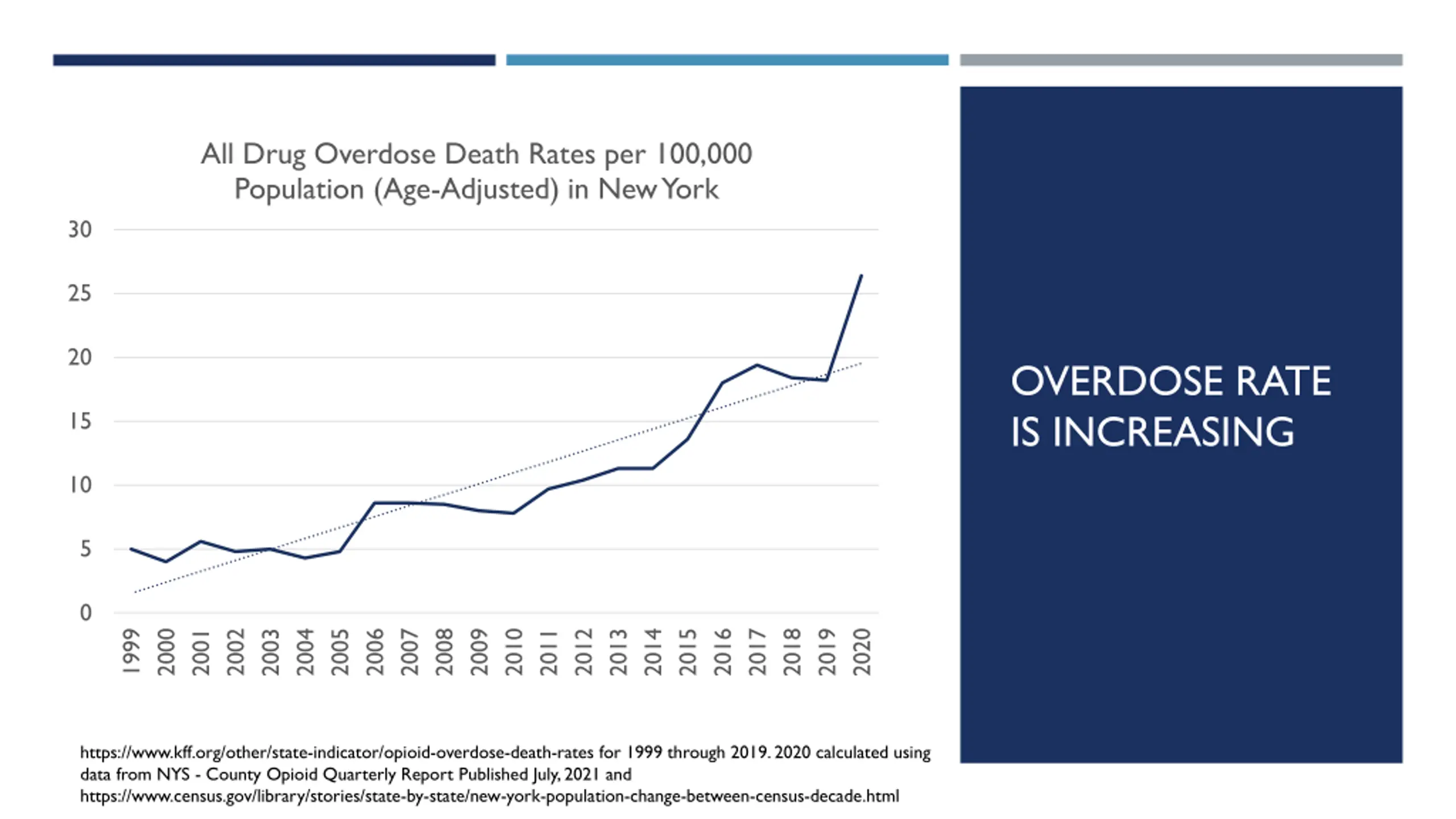 All Drug Overdose Death Rates per 100,000 Population (Age-Adjusted) in New York 30 25 20 OVERDOSE RATE IS INCREASING 15 10 5 0 1999 2000 2001 2002 2003 2004 2005 2006 2007 2008 2009 2010 2011 2012 2013 2014 2015 2016 2017 2018 2019 2020 https://www.kff.org/other/state-indicator/opioid-overdose-death-rates for 1999 through 2019. 2020 calculated using data from NYS - County Opioid Quarterly Report Published July, 2021 and https://www.census.gov/library/stories/state-by-state/new-york-population-change-between-census-decade.html