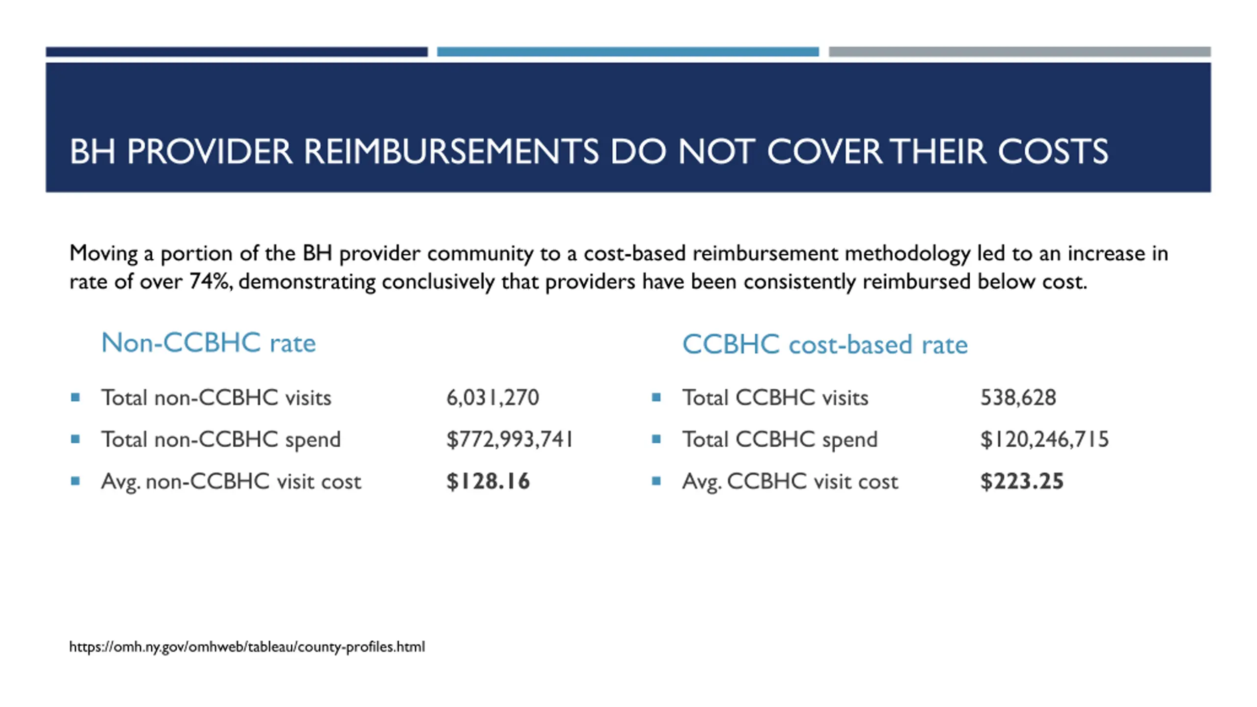 BH PROVIDER REIMBURSEMENTS DO NOT COVER THEIR COSTS Moving a portion of the BH provider community to a cost-based reimbursement methodology led to an increase in rate of over 74%, demonstrating conclusively that providers have been consistently reimbursed below cost. Non-CCBHC rate CCBHC cost-based rate Total non-CCBHC visits 6,031,270 Total CCBHC visits 538,628 Total non-CCBHC spend $772,993,741 Total CCBHC spend $120,246,715 Avg. non-CCBHC visit cost $128.16 Avg. CCBHC visit cost $223.25 https://omh.ny.gov/omhweb/tableau/county-profiles.html