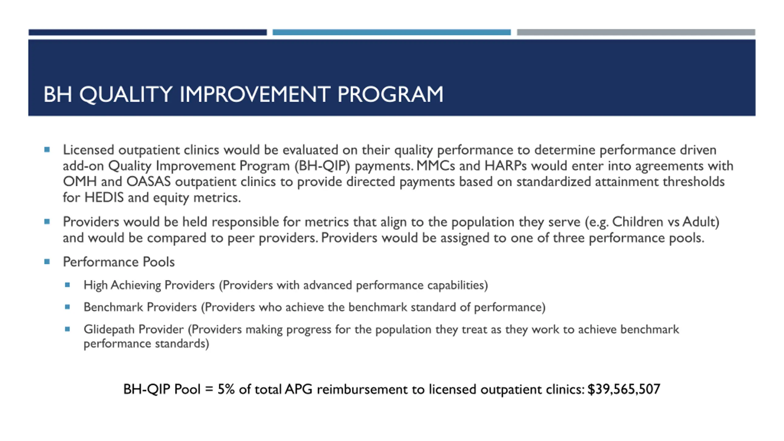 BH QUALITY IMPROVEMENT PROGRAM Licensed outpatient clinics would be evaluated on their quality performance to determine performance driven add-on Quality Improvement Program (BH-QIP) payments. MMCs and HARPs would enter into agreements with OMH and OASAS outpatient clinics to provide directed payments based on standardized attainment thresholds for HEDIS and equity metrics. Providers would be held responsible for metrics that align to the population they serve (e.g. Children vs Adult) and would be compared to peer providers. Providers would be assigned to one of three performance pools. Performance Pools High Achieving Providers (Providers with advanced performance capabilities) Benchmark Providers (Providers who achieve the benchmark standard of performance) Glidepath Provider (Providers making progress for the population they treat as they work to achieve benchmark performance standards) BH-QIP Pool = 5% of total APG reimbursement to licensed outpatient clinics: $39,565,507