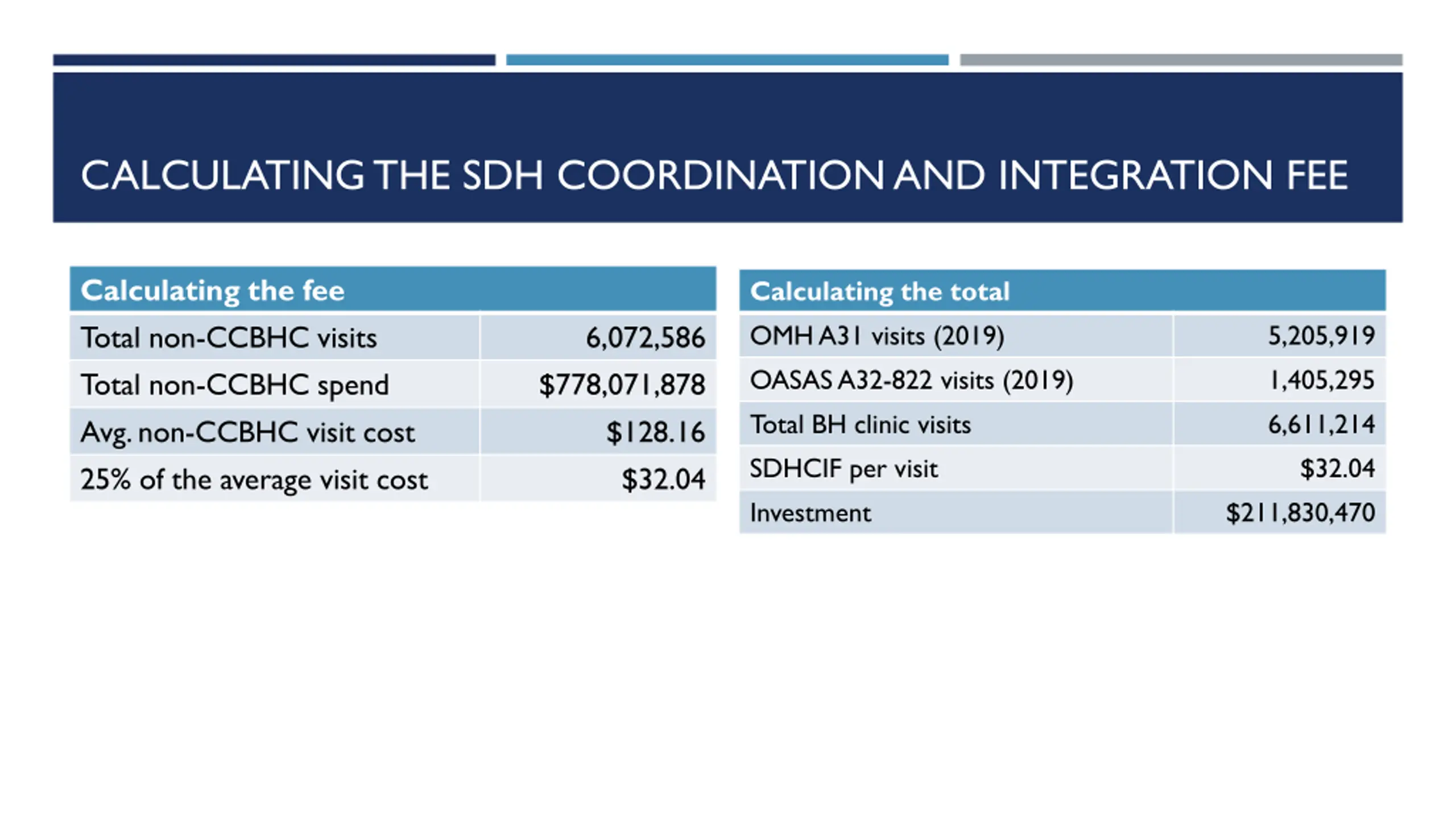 CALCULATING THE SDH COORDINATION AND INTEGRATION FEE Calculating the fee Total non-CCBHC visits Total non-CCBHC spend Avg. non-CCBHC visit cost 25% of the average visit cost Calculating the total OMH A31 visits (2019) OASAS A32-822 visits (2019) Total BH clinic visits SDHCIF per visit Investment 5,205,919 1,405,295 6,611,214 $32.04 $211,830,470 6,072,586 $778,071,878 $128.16 $32.04