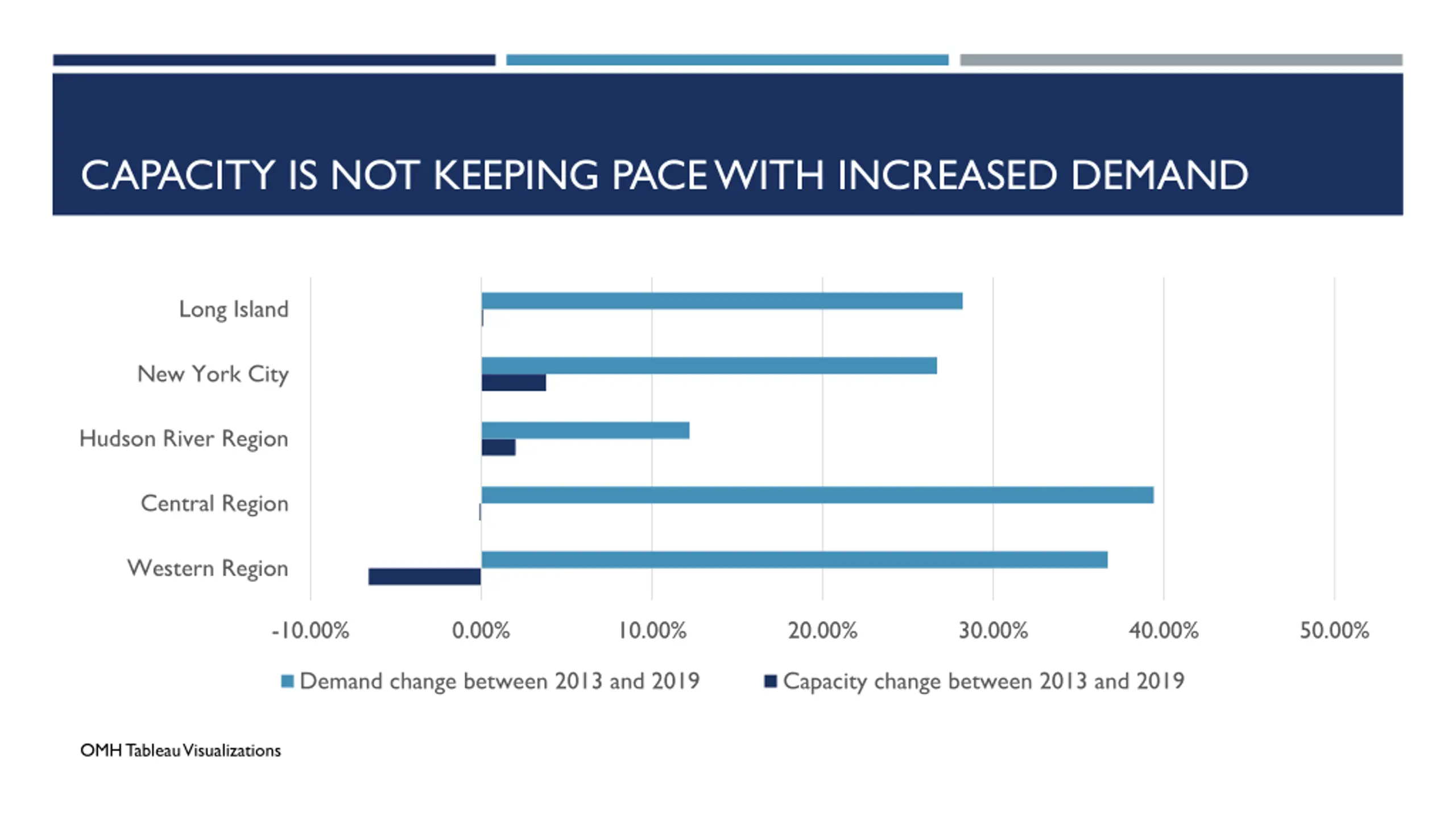 CAPACITY IS NOT KEEPING PACE WITH INCREASED DEMAND Long Island New York City Hudson River Region Central Region Western Region -10.00% 0.00% 10.00% 20.00% 30.00% 40.00% 50.00% Demand change between 2013 and 2019 Capacity change between 2013 and 2019 OMH Tableau Visualizations