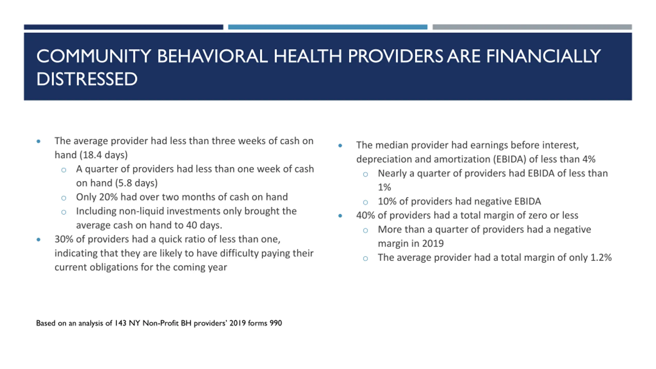 COMMUNITY BEHAVIORAL HEALTH PROVIDERS ARE FINANCIALLY DISTRESSED The average provider had less than three weeks of cash on hand (18.4 days) o A quarter of providers had less than one week of cash on hand (5.8 days) o Only 20% had over two months of cash on hand o Including non-liquid investments only brought the average cash on hand to 40 days. 30% of providers had a quick ratio of less than one, indicating that they are likely to have difficulty paying their current obligations for the coming year The median provider had earnings before interest, depreciation and amortization (EBIDA) of less than 4% o Nearly a quarter of providers had EBIDA of less than 1% o 10% of providers had negative EBIDA 40% of providers had a total margin of zero or less o More than a quarter of providers had a negative margin in 2019 o The average provider had a total margin of only 1.2% Based on an analysis of 143 NY Non-Profit BH providers 2019 forms 990