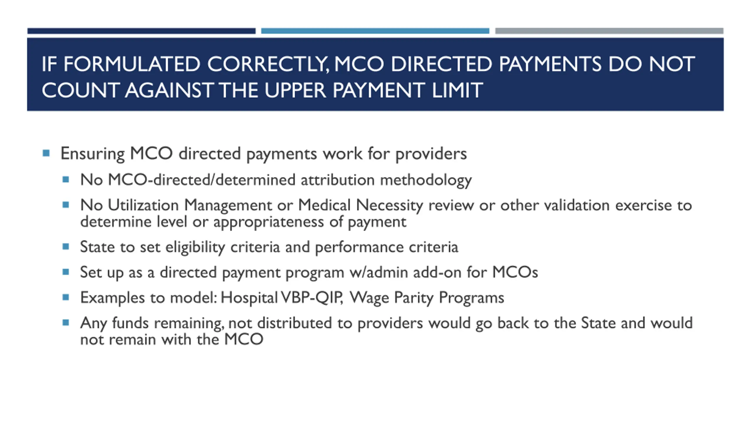 IF FORMULATED CORRECTLY, MCO DIRECTED PAYMENTS DO NOT COUNT AGAINST THE UPPER PAYMENT LIMIT Ensuring MCO directed payments work for providers No MCO-directed/determined attribution methodology No Utilization Management or Medical Necessity review or other validation exercise to determine level or appropriateness of payment State to set eligibility criteria and performance criteria Set up as a directed payment program w/admin add-on for MCOs Examples to model: Hospital VBP-QIP, Wage Parity Programs Any funds remaining, not distributed to providers would go back to the State and would not remain with the MCO