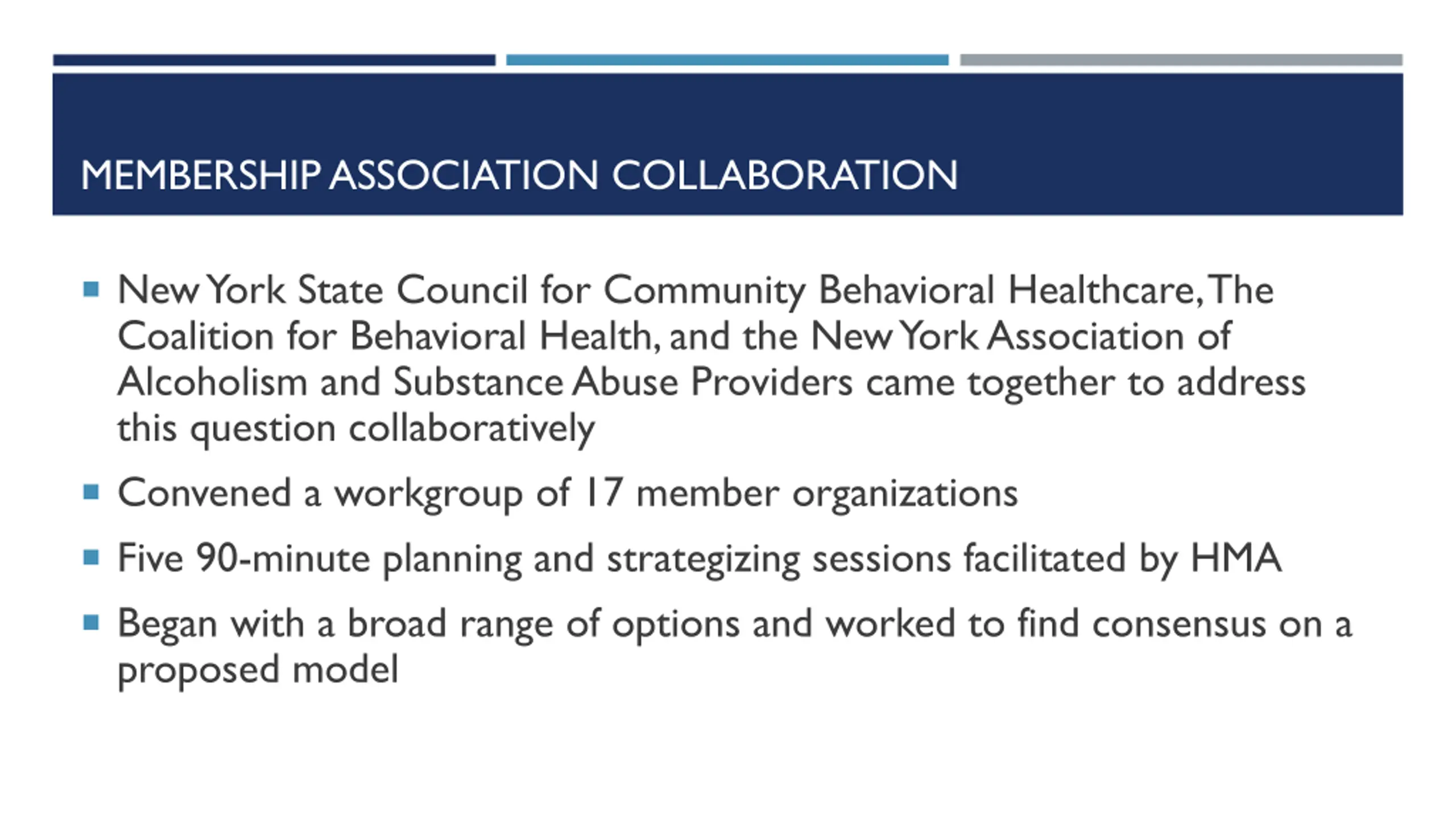 MEMBERSHIP ASSOCIATION COLLABORATION New York State Council for Community Behavioral Healthcare, The Coalition for Behavioral Health, and the New York Association of Alcoholism and Substance Abuse Providers came together to address this question collaboratively Convened a workgroup of 17 member organizations Five 90-minute planning and strategizing sessions facilitated by HMA Began with a broad range of options and worked to find consensus on a proposed model