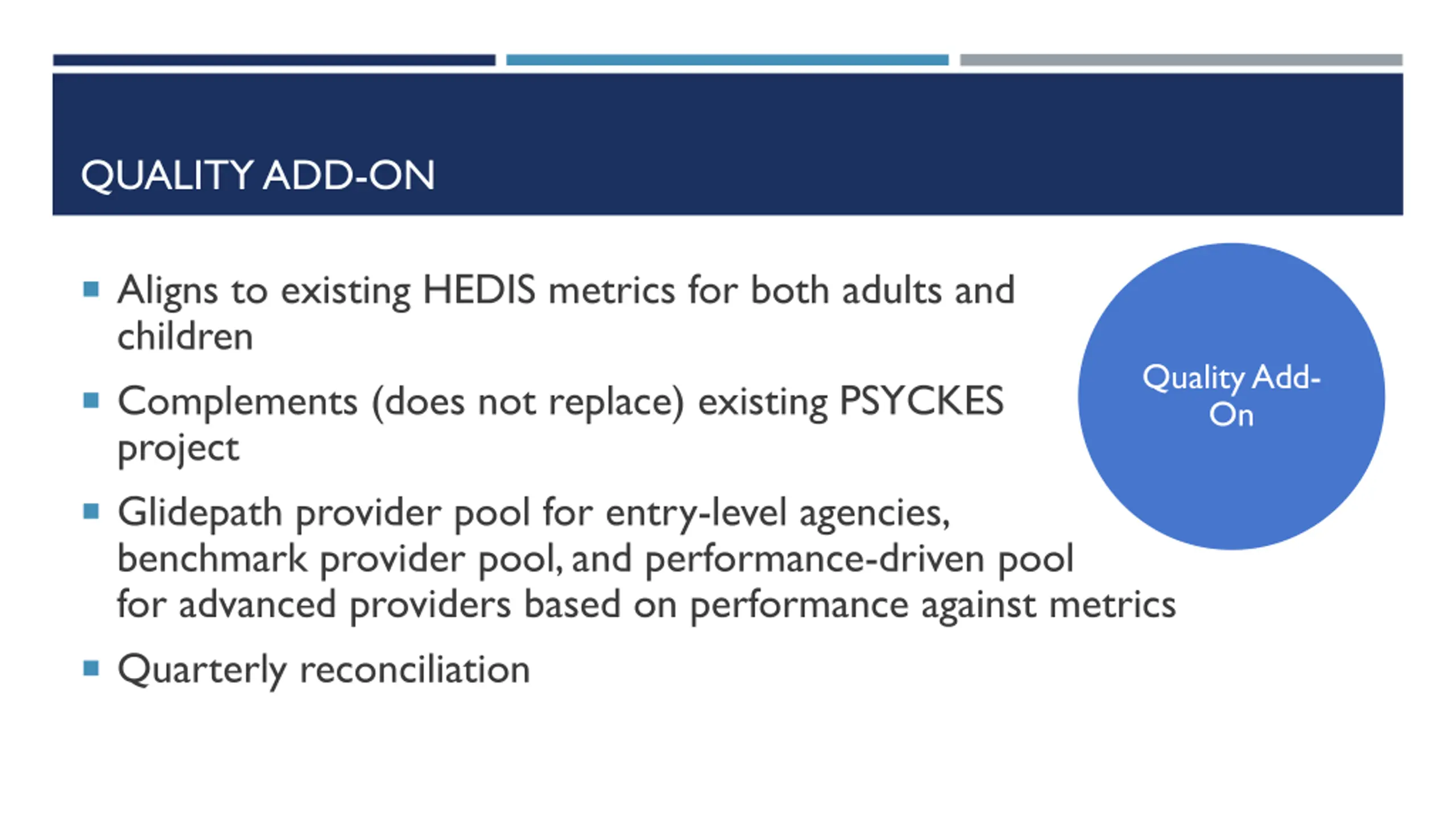QUALITY ADD-ON Aligns to existing HEDIS metrics for both adults and children Complements (does not replace) existing PSYCKES project Glidepath provider pool for entry-level agencies, benchmark provider pool, and performance-driven pool for advanced providers based on performance against metrics Quarterly reconciliation Quality Add- On