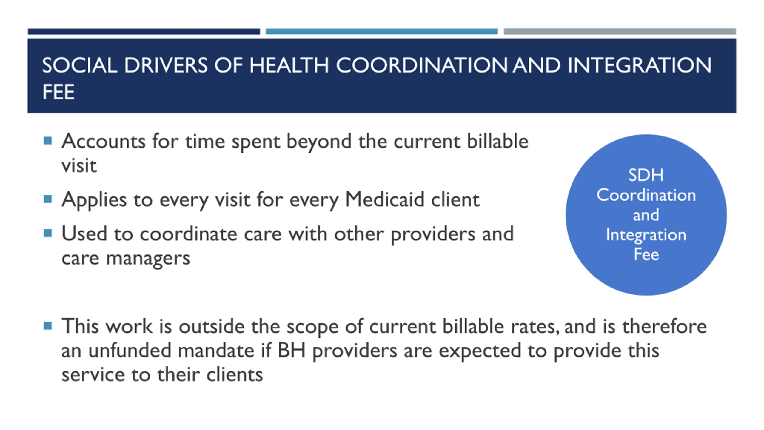 SOCIAL DRIVERS OF HEALTH COORDINATION AND INTEGRATION FEE Accounts for time spent beyond the current billable visit Applies to every visit for every Medicaid client Used to coordinate care with other providers and care managers SDH Coordination and Integration Fee This work is outside the scope of current billable rates, and is therefore an unfunded mandate if BH providers are expected to provide this service to their clients