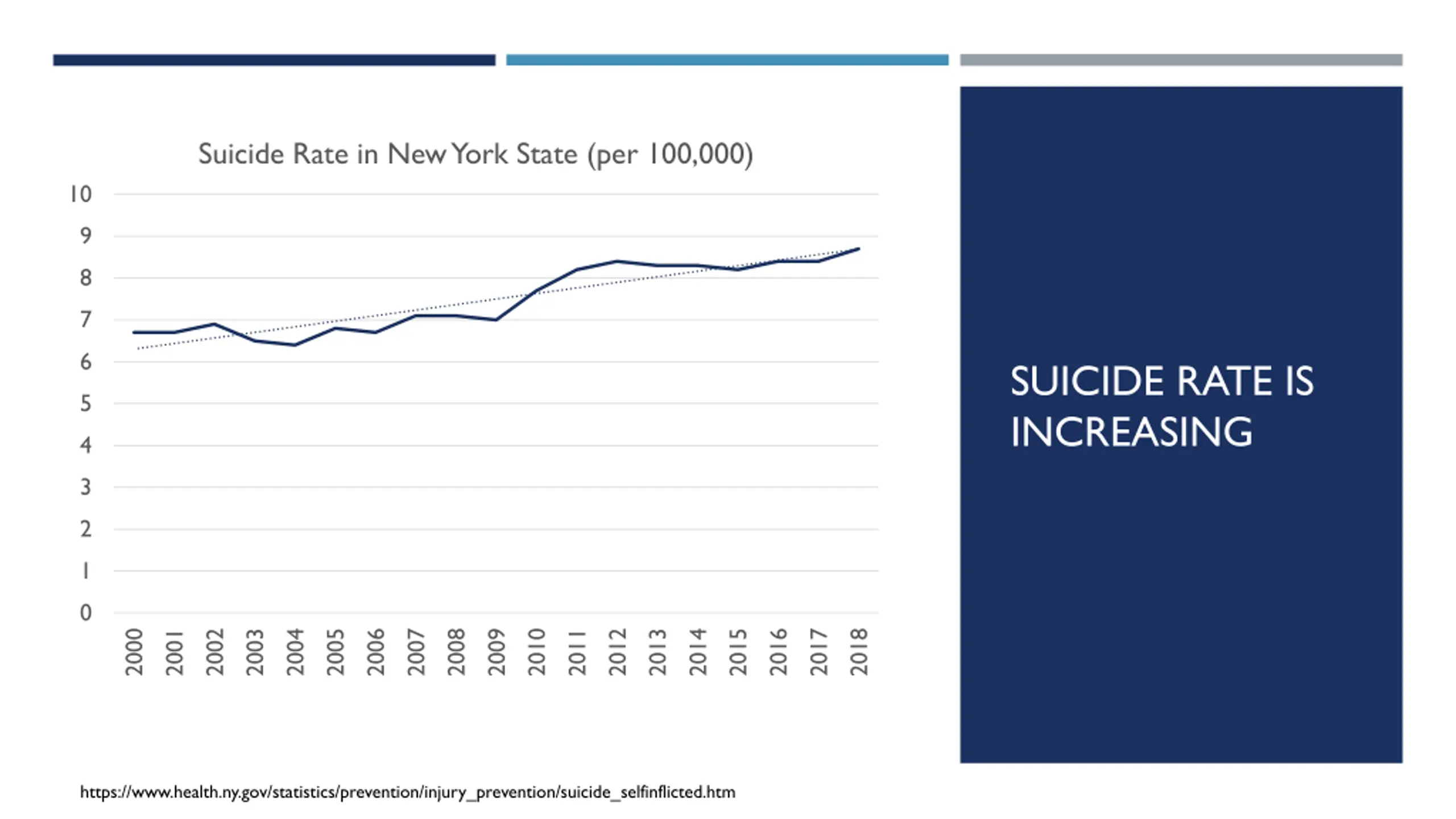 Suicide Rate in New York State (per 100,000) 10 9 8 7 6 SUICIDE RATE IS INCREASING 5 4 3 2 1 0 2000 2001 2002 2003 2004 2005 2006 2007 2008 2009 2010 2011 2012 2013 2014 2015 2016 2017 2018 https://www.health.ny.gov/statistics/prevention/injury_prevention/suicide_selfinflicted.htm