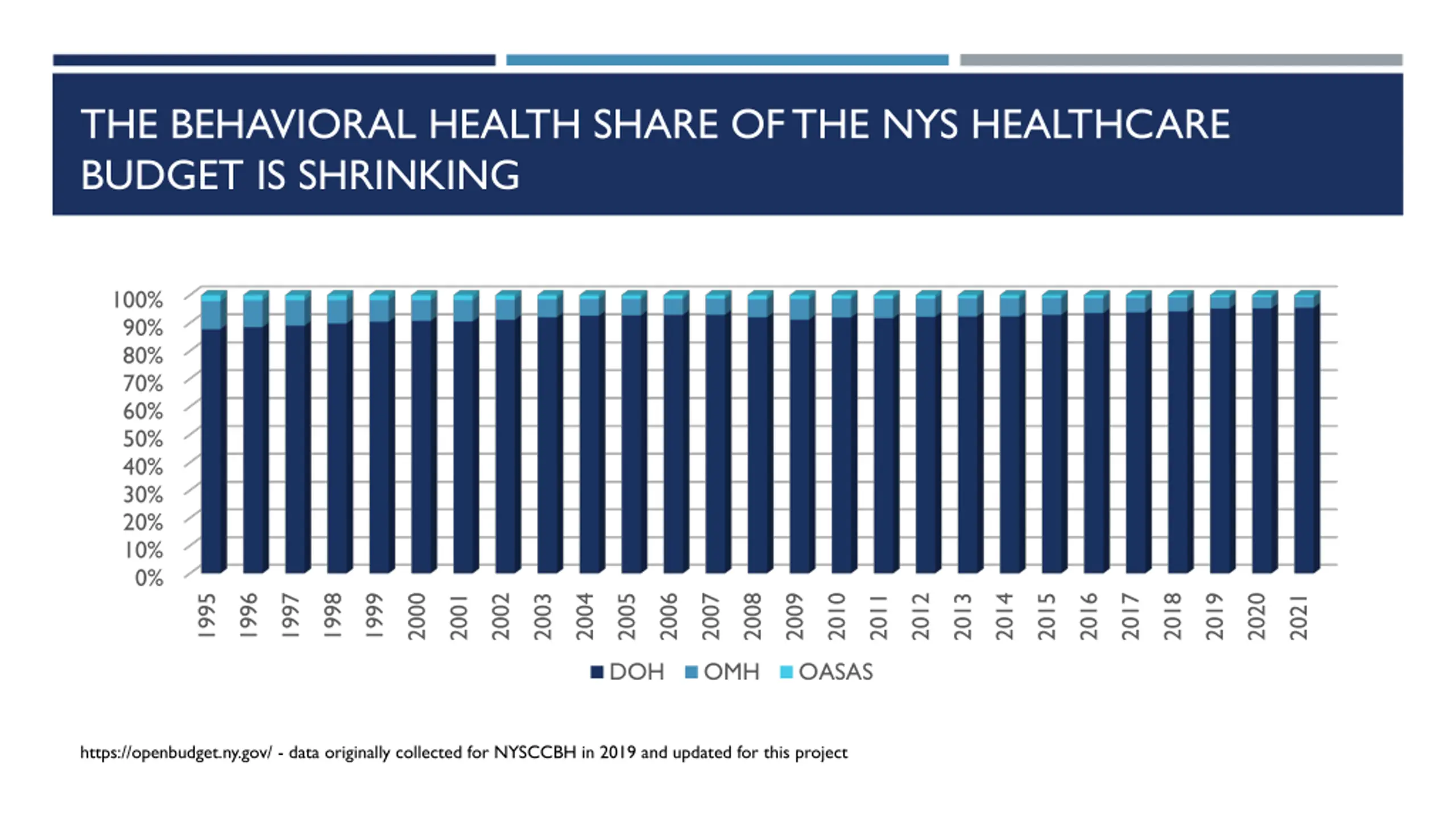 THE BEHAVIORAL HEALTH SHARE OF THE NYS HEALTHCARE BUDGET IS SHRINKING 100% 90% 80% 70% 60% 50% 40% 30% 20% 10% 0% 1996 2019 1995 1997 1998 1999 2000 2001 2002 2003 2004 2005 2006 2007 2008 2009 2010 2011 2012 2013 2014 2015 2016 2017 2018 2020 2021 DOH OMH OASAS https://openbudget.ny.gov/ - data originally collected for NYSCCBH in 2019 and updated for this project