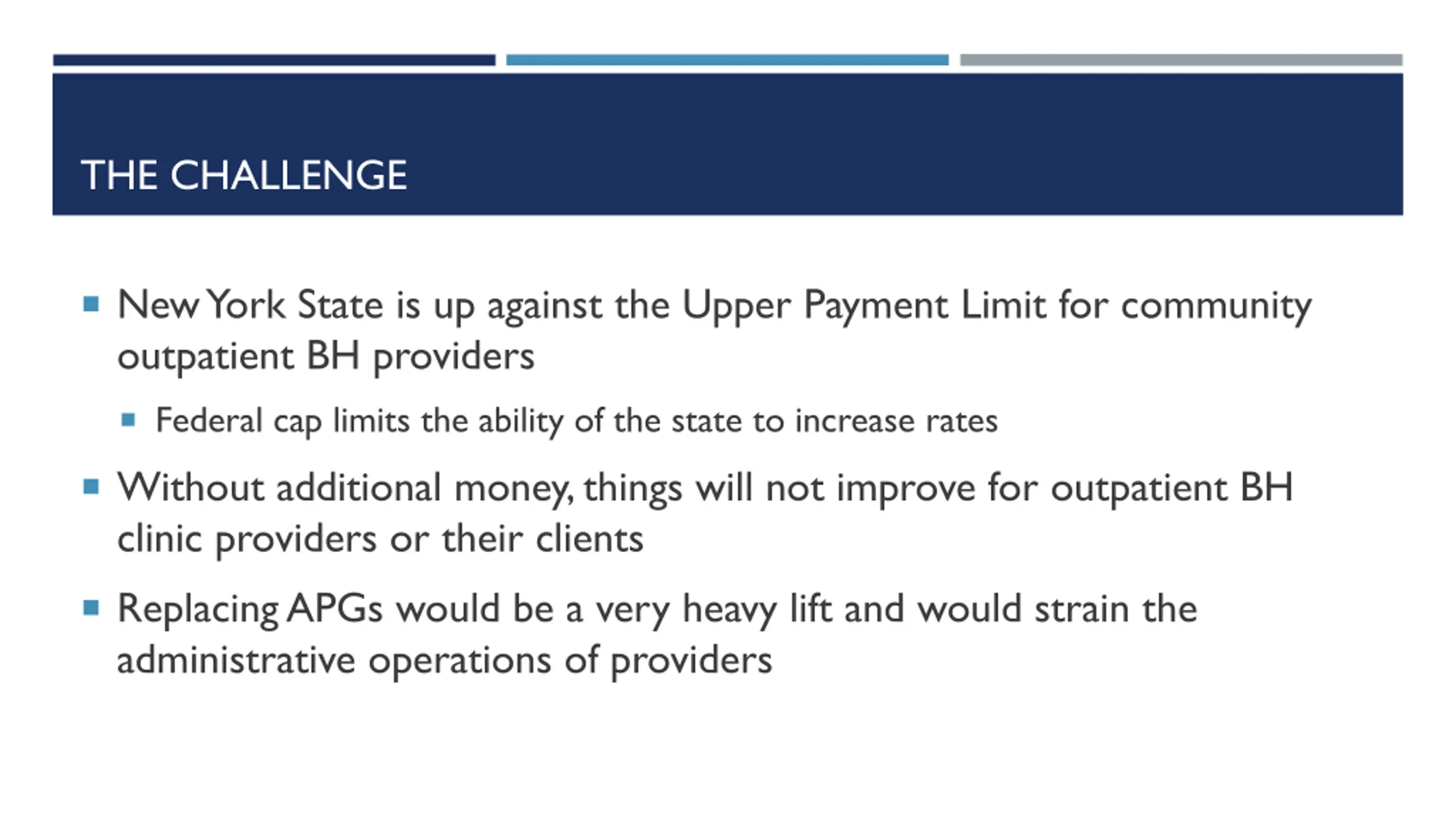 THE CHALLENGE New York State is up against the Upper Payment Limit for community outpatient BH providers Federal cap limits the ability of the state to increase rates Without additional money, things will not improve for outpatient BH clinic providers or their clients Replacing APGs would be a very heavy lift and would strain the administrative operations of providers