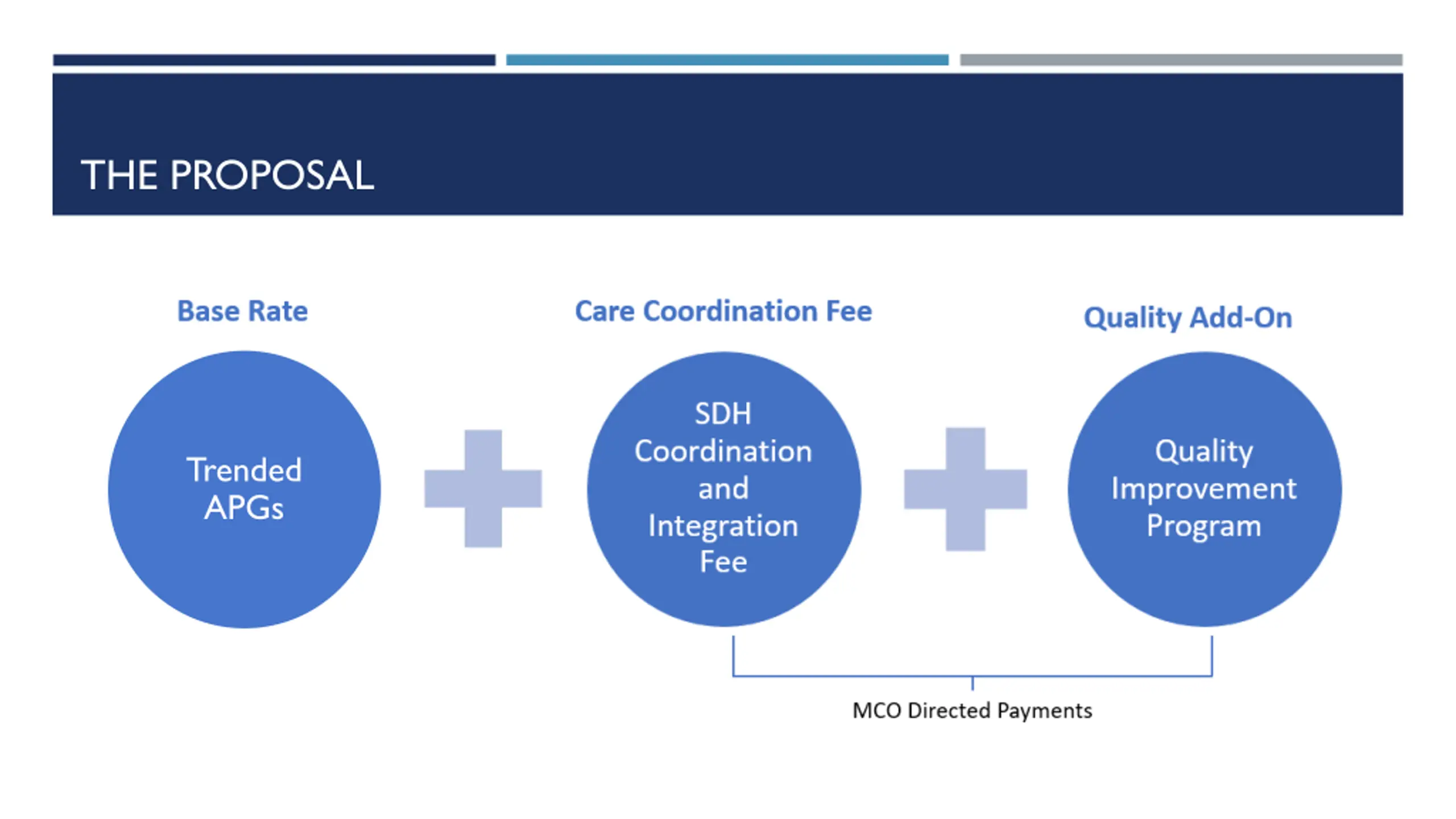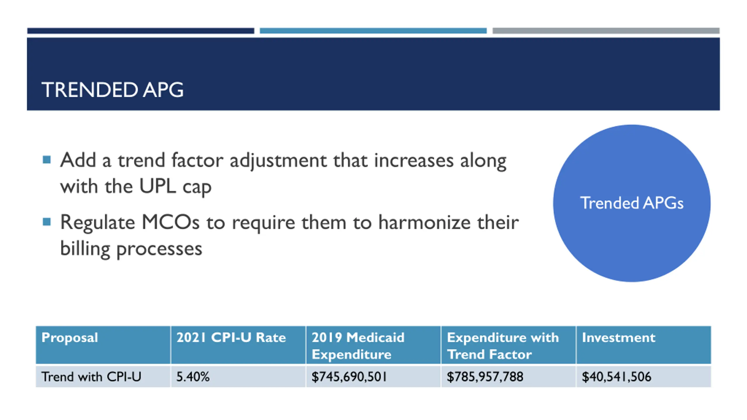 TRENDED APG Add a trend factor adjustment that increases along with the UPL cap Trended APGs Regulate MCOs to require them to harmonize their billing processes Proposal 2021 CPI-U Rate 2019 Medicaid Expenditure $745,690,501 Expenditure with Trend Factor $785,957,788 Investment Trend with CPI-U 5.40% $40,541,506