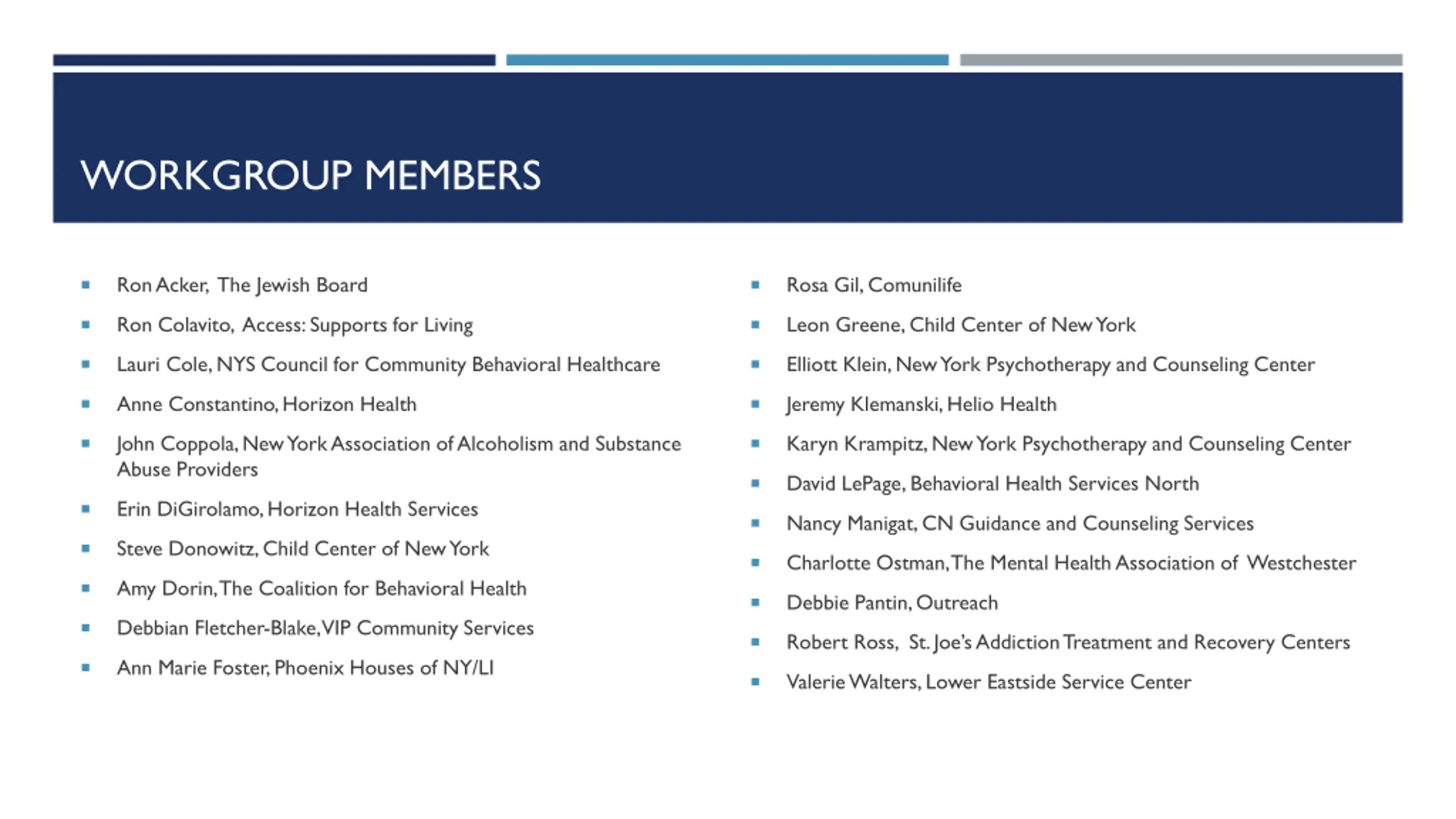 WORKGROUP MEMBERS Ron Acker, The Jewish Board Rosa Gil, Comunilife Ron Colavito, Access: Supports for Living Leon Greene, Child Center of New York Lauri Cole, NYS Council for Community Behavioral Healthcare Elliott Klein, New York Psychotherapy and Counseling Center Anne Constantino, Horizon Health Jeremy Klemanski, Helio Health John Coppola, New York Association of Alcoholism and Substance Abuse Providers Karyn Krampitz, New York Psychotherapy and Counseling Center David LePage, Behavioral Health Services North Erin DiGirolamo, Horizon Health Services Nancy Manigat, CN Guidance and Counseling Services Steve Donowitz, Child Center of New York Charlotte Ostman, The Mental Health Association of Westchester Amy Dorin, The Coalition for Behavioral Health Debbie Pantin, Outreach Debbian Fletcher-Blake, VIP Community Services Robert Ross, St. Joe s Addiction Treatment and Recovery Centers Ann Marie Foster, Phoenix Houses of NY/LI Valerie Walters, Lower Eastside Service Center