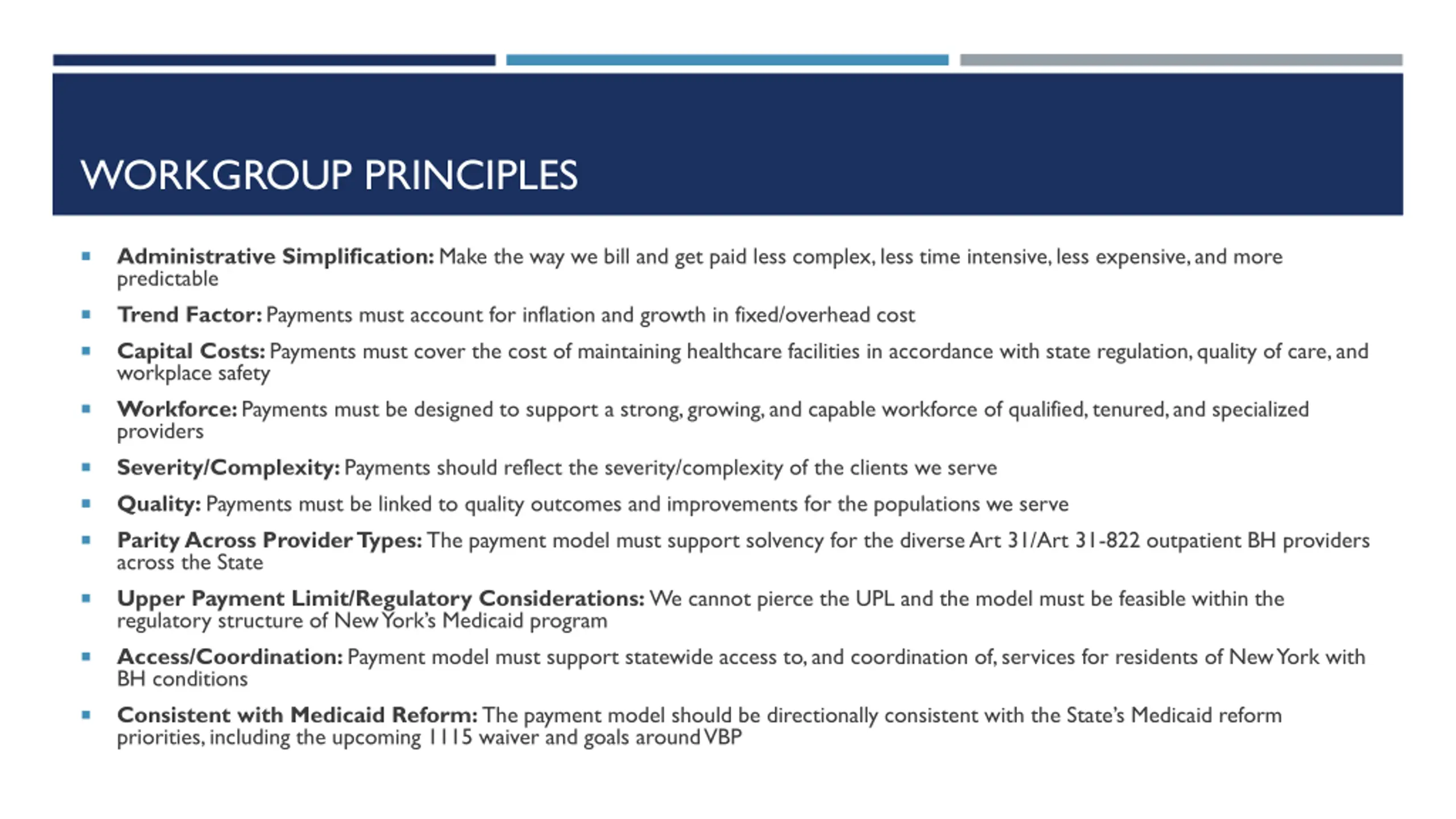 WORKGROUP PRINCIPLES Administrative Simplification: Make the way we bill and get paid less complex, less time intensive, less expensive, and more predictable Trend Factor: Payments must account for inflation and growth in fixed/overhead cost Capital Costs: Payments must cover the cost of maintaining healthcare facilities in accordance with state regulation, quality of care, and workplace safety Workforce: Payments must be designed to support a strong, growing, and capable workforce of qualified, tenured, and specialized providers Severity/Complexity: Payments should reflect the severity/complexity of the clients we serve Quality: Payments must be linked to quality outcomes and improvements for the populations we serve Parity Across Provider Types: The payment model must support solvency for the diverse Art 31/Art 31-822 outpatient BH providers across the State Upper Payment Limit/Regulatory Considerations: We cannot pierce the UPL and the model must be feasible within the regulatory structure of New York s Medicaid program Access/Coordination: Payment model must support statewide access to, and coordination of, services for residents of New York with BH conditions Consistent with Medicaid Reform: The payment model should be directionally consistent with the State s Medicaid reform priorities, including the upcoming 1115 waiver and goals around VBP