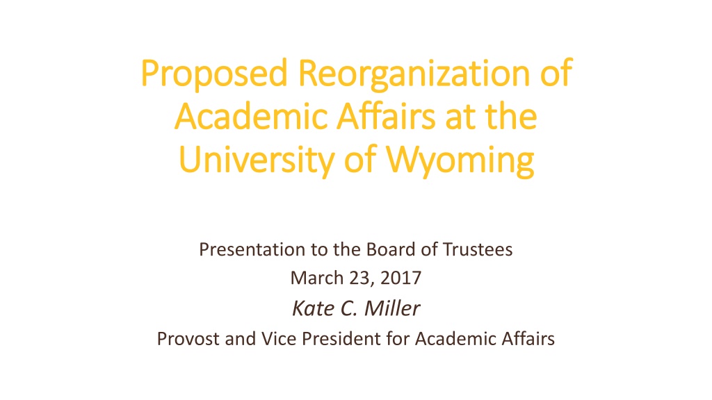 Proposed Reorganization of Proposed Reorganization of Academic Affairs at the Academic Affairs at the University of Wyoming University of Wyoming Presentation to the Board of Trustees March 23, 2017 Kate C. Miller Provost and Vice President for Academic Affairs