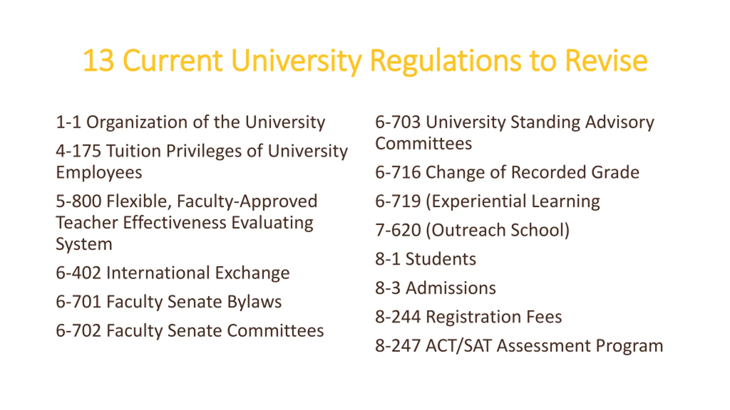 13 Current University Regulations to Revise 13 Current University Regulations to Revise 1-1 Organization of the University 4-175 Tuition Privileges of University Employees 5-800 Flexible, Faculty-Approved Teacher Effectiveness Evaluating System 6-402 International Exchange 6-701 Faculty Senate Bylaws 6-702 Faculty Senate Committees 6-703 University Standing Advisory Committees 6-716 Change of Recorded Grade 6-719 (Experiential Learning 7-620 (Outreach School) 8-1 Students 8-3 Admissions 8-244 Registration Fees 8-247 ACT/SAT Assessment Program
