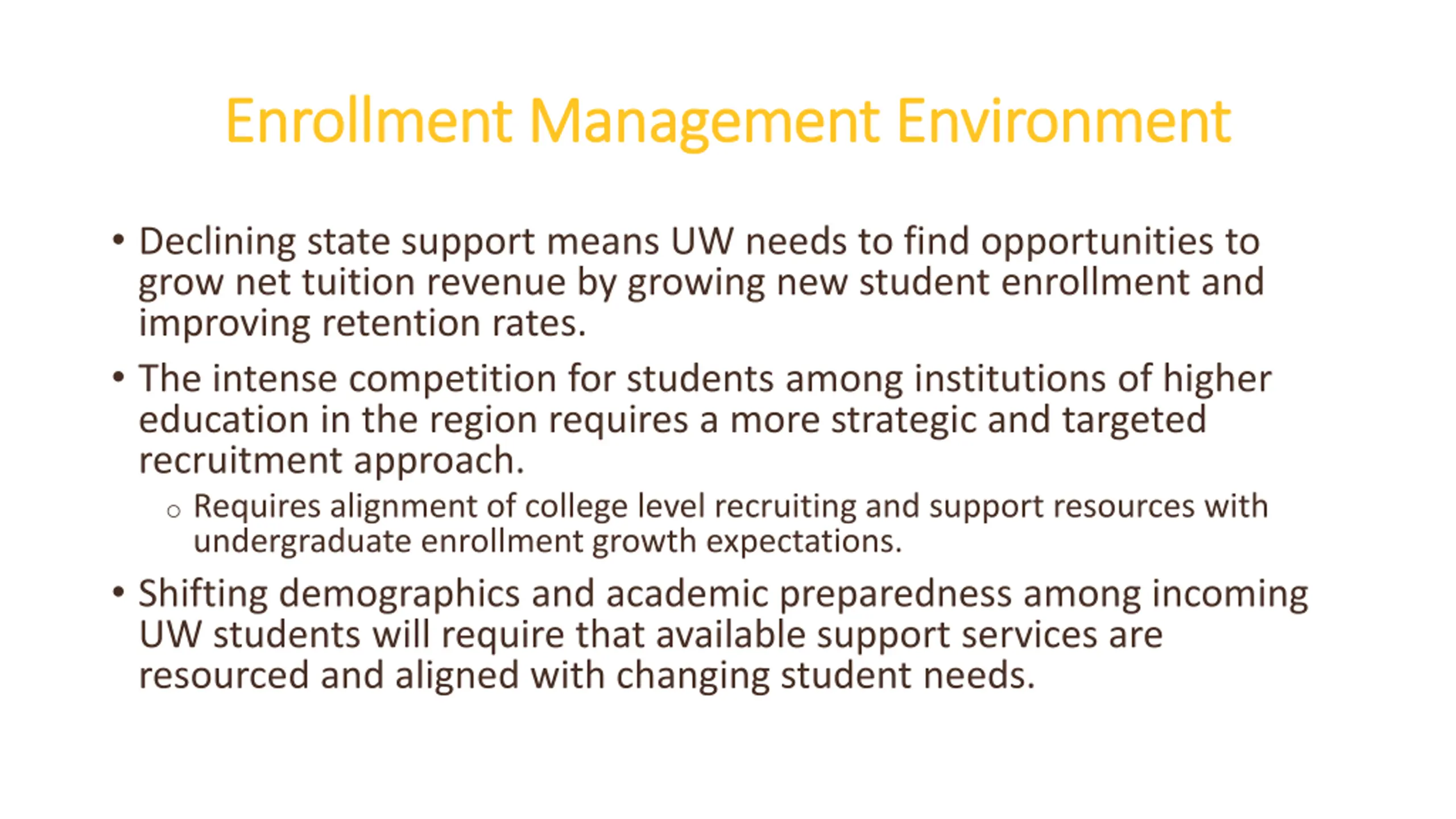Enrollment Management Environment Enrollment Management Environment Declining state support means UW needs to find opportunities to grow net tuition revenue by growing new student enrollment and improving retention rates. The intense competition for students among institutions of higher education in the region requires a more strategic and targeted recruitment approach. o Requires alignment of college level recruiting and support resources with undergraduate enrollment growth expectations. Shifting demographics and academic preparedness among incoming UW students will require that available support services are resourced and aligned with changing student needs.