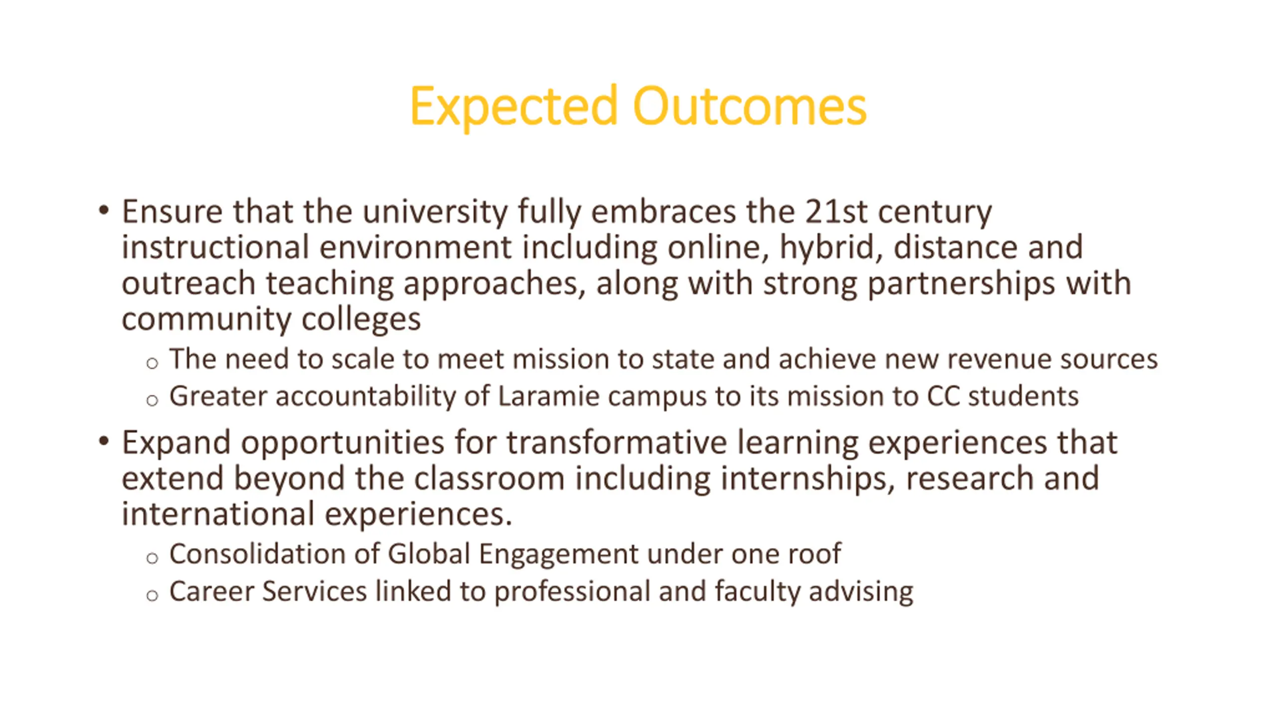 Expected Outcomes Expected Outcomes Ensure that the university fully embraces the 21st century instructional environment including online, hybrid, distance and outreach teaching approaches, along with strong partnerships with community colleges o The need to scale to meet mission to state and achieve new revenue sources o Greater accountability of Laramie campus to its mission to CC students Expand opportunities for transformative learning experiences that extend beyond the classroom including internships, research and international experiences. o Consolidation of Global Engagement under one roof o Career Services linked to professional and faculty advising