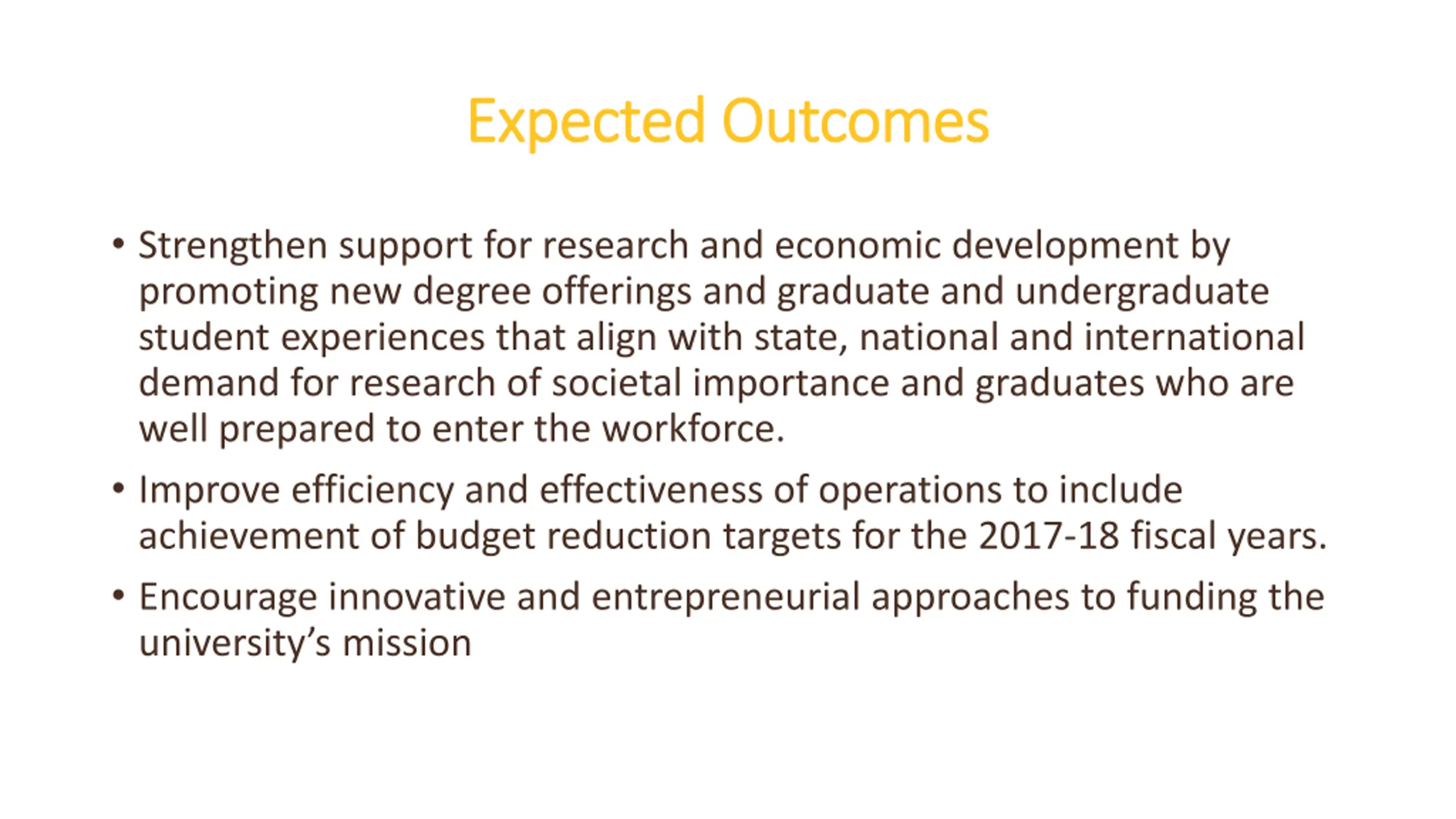 Expected Outcomes Expected Outcomes Strengthen support for research and economic development by promoting new degree offerings and graduate and undergraduate student experiences that align with state, national and international demand for research of societal importance and graduates who are well prepared to enter the workforce. Improve efficiency and effectiveness of operations to include achievement of budget reduction targets for the 2017-18 fiscal years. Encourage innovative and entrepreneurial approaches to funding the university s mission
