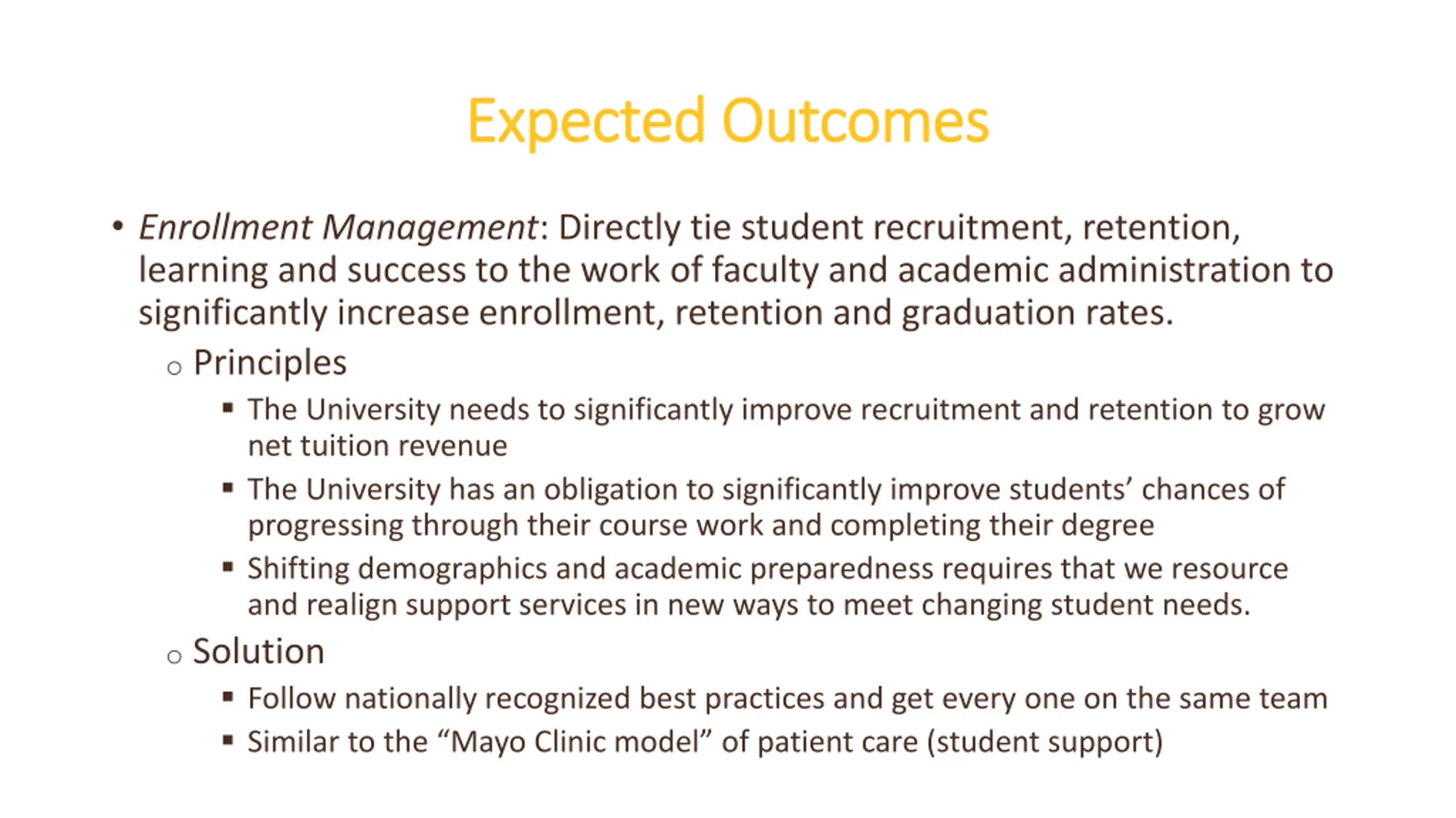 Expected Outcomes Expected Outcomes Enrollment Management: Directly tie student recruitment, retention, learning and success to the work of faculty and academic administration to significantly increase enrollment, retention and graduation rates. o Principles The University needs to significantly improve recruitment and retention to grow net tuition revenue The University has an obligation to significantly improve students chances of progressing through their course work and completing their degree Shifting demographics and academic preparedness requires that we resource and realign support services in new ways to meet changing student needs. o Solution Follow nationally recognized best practices and get every one on the same team Similar to the Mayo Clinic model of patient care (student support)