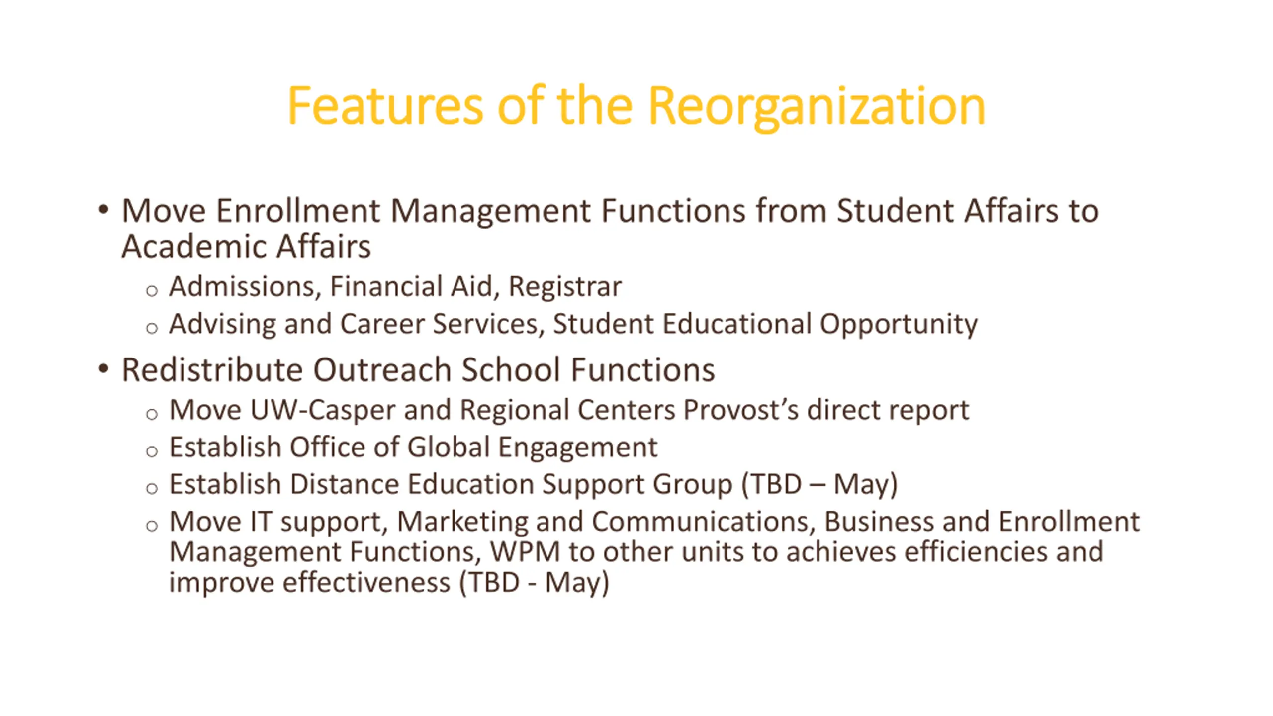 Features of the Reorganization Features of the Reorganization Move Enrollment Management Functions from Student Affairs to Academic Affairs o Admissions, Financial Aid, Registrar o Advising and Career Services, Student Educational Opportunity Redistribute Outreach School Functions o Move UW-Casper and Regional Centers Provost s direct report o Establish Office of Global Engagement o Establish Distance Education Support Group (TBD May) o Move IT support, Marketing and Communications, Business and Enrollment Management Functions, WPM to other units to achieves efficiencies and improve effectiveness (TBD - May)