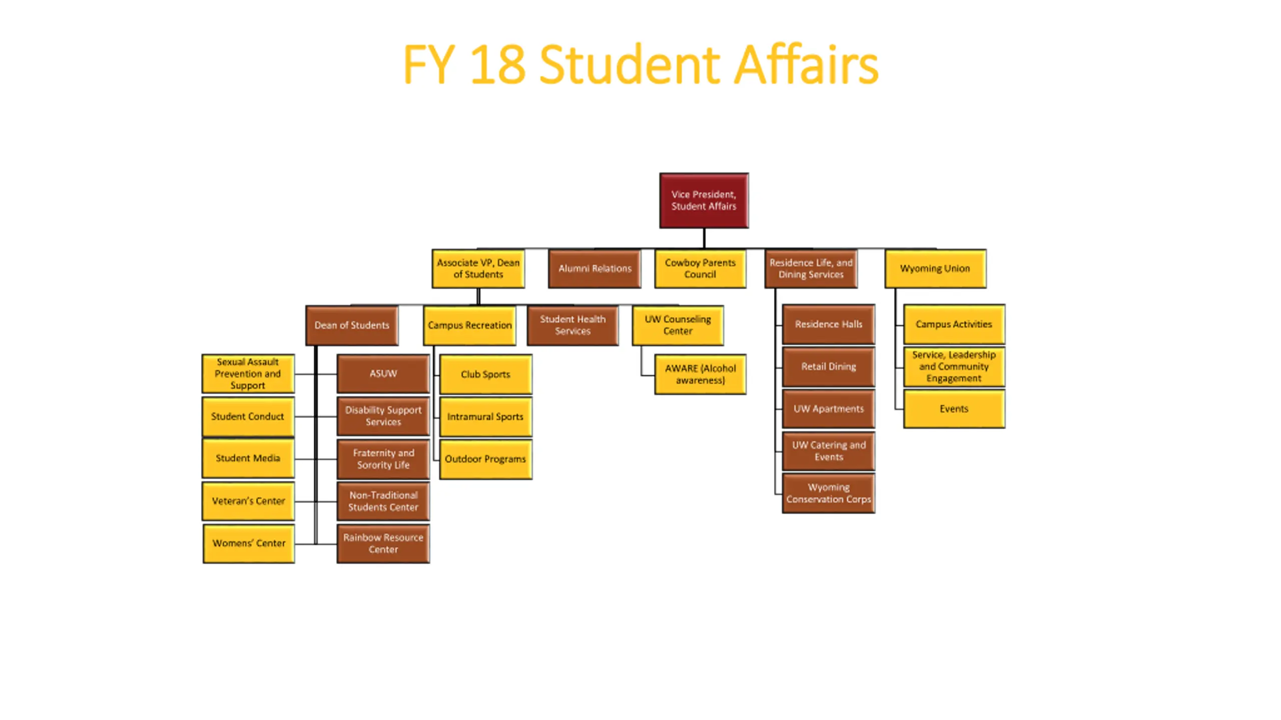 FY 18 Student Affairs FY 18 Student Affairs Vice President, Student Affairs Associate VP, Dean of Students Cowboy Parents Council Residence Life, and Dining Services Alumni Relations Wyoming Union Student Health Services UW Counseling Center Residence Halls Campus Activities Dean of Students Campus Recreation Service, Leadership and Community Engagement Sexual Assault Prevention and Support Retail Dining AWARE (Alcohol awareness) ASUW Club Sports UW Apartments Events Disability Support Services Student Conduct Intramural Sports UW Catering and Events Fraternity and Sorority Life Student Media Outdoor Programs Wyoming Conservation Corps Non-Traditional Students Center Veteran s Center Rainbow Resource Center Womens Center