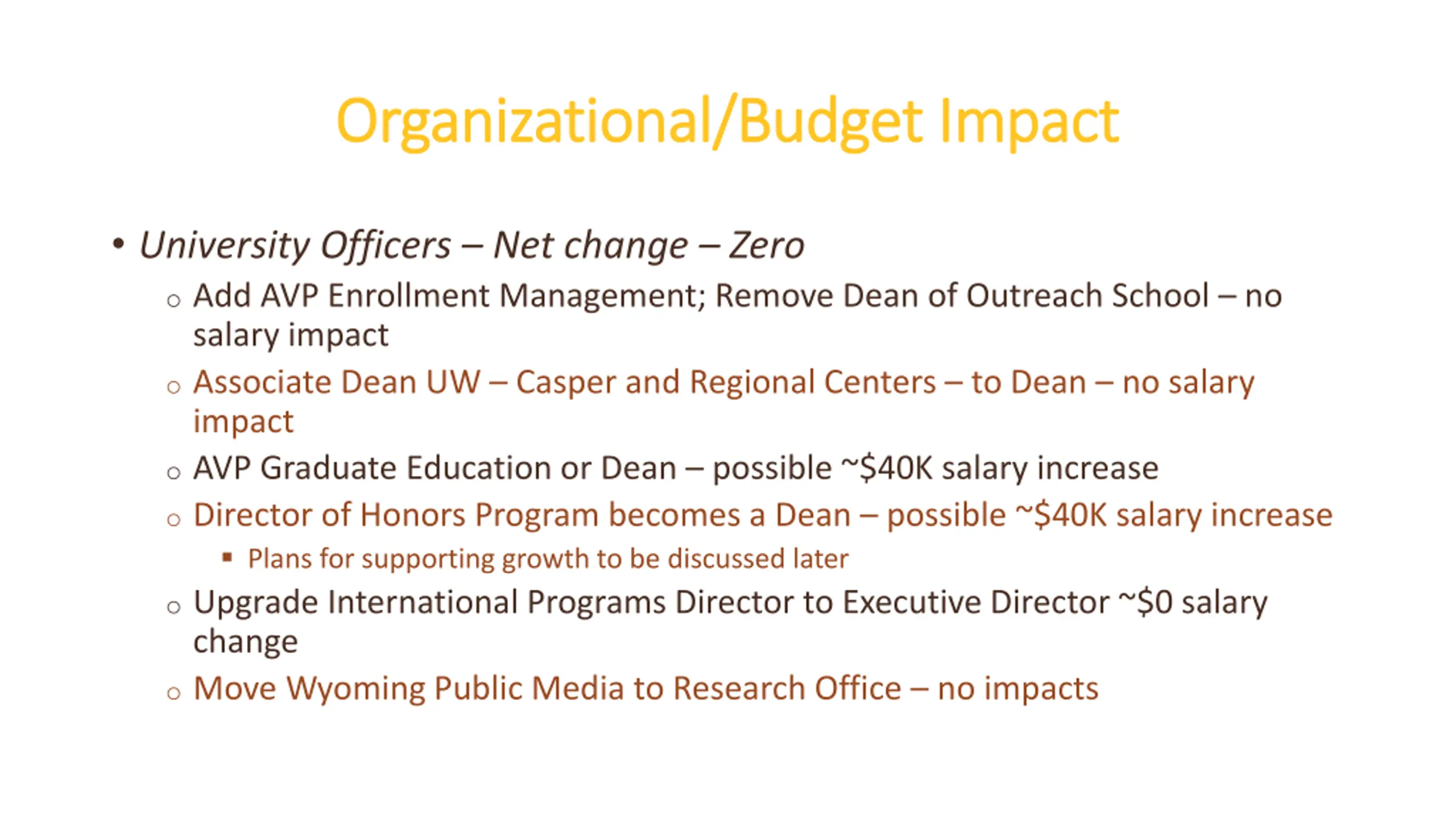 Organizational/Budget Impact Organizational/Budget Impact University Officers Net change Zero o Add AVP Enrollment Management; Remove Dean of Outreach School no salary impact o Associate Dean UW Casper and Regional Centers to Dean no salary impact o AVP Graduate Education or Dean possible ~$40K salary increase o Director of Honors Program becomes a Dean possible ~$40K salary increase Plans for supporting growth to be discussed later o Upgrade International Programs Director to Executive Director ~$0 salary change o Move Wyoming Public Media to Research Office no impacts