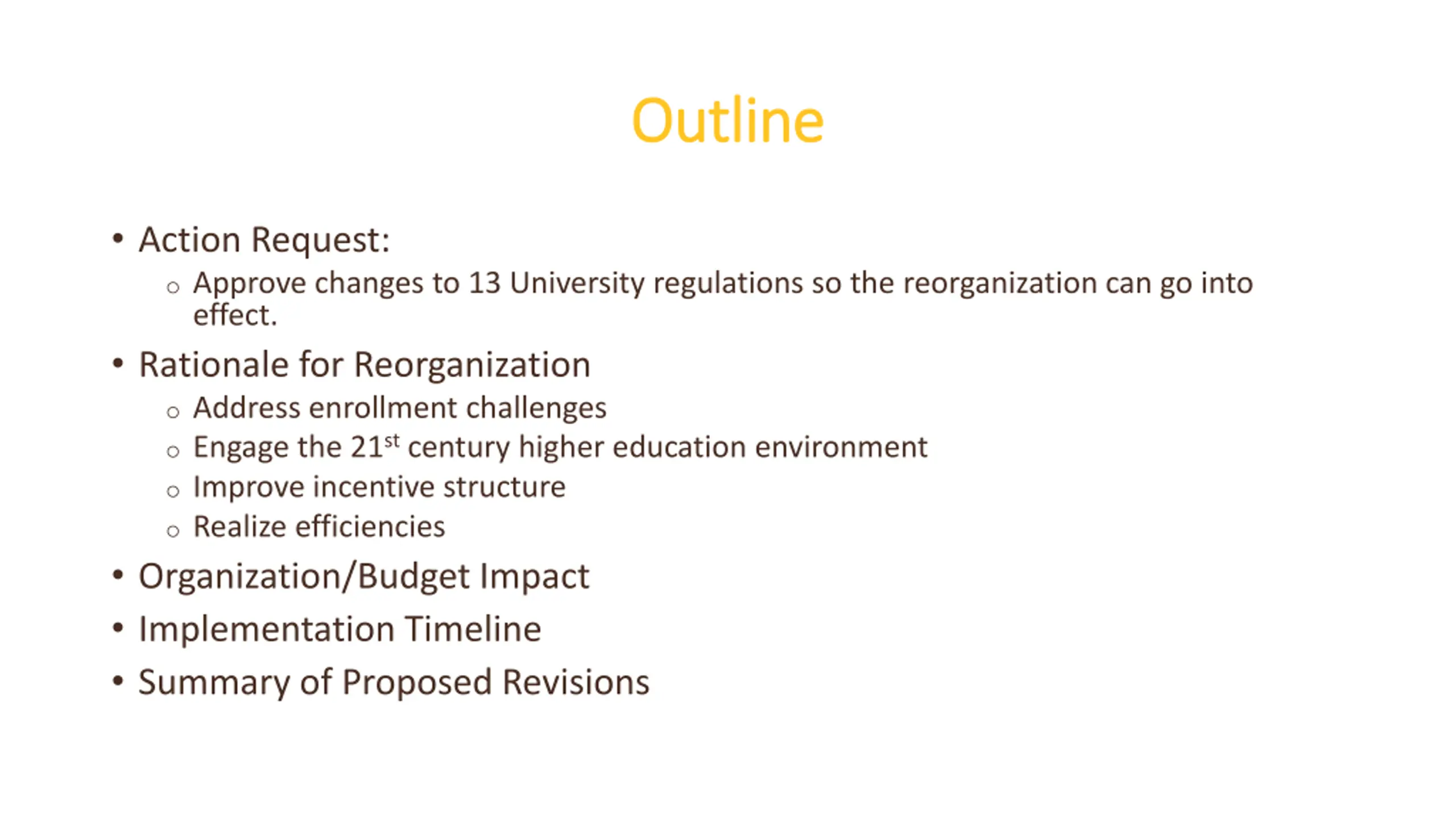 Outline Outline Action Request: o Approve changes to 13 University regulations so the reorganization can go into effect. Rationale for Reorganization o Address enrollment challenges o Engage the 21stcentury higher education environment o Improve incentive structure o Realize efficiencies Organization/Budget Impact Implementation Timeline Summary of Proposed Revisions