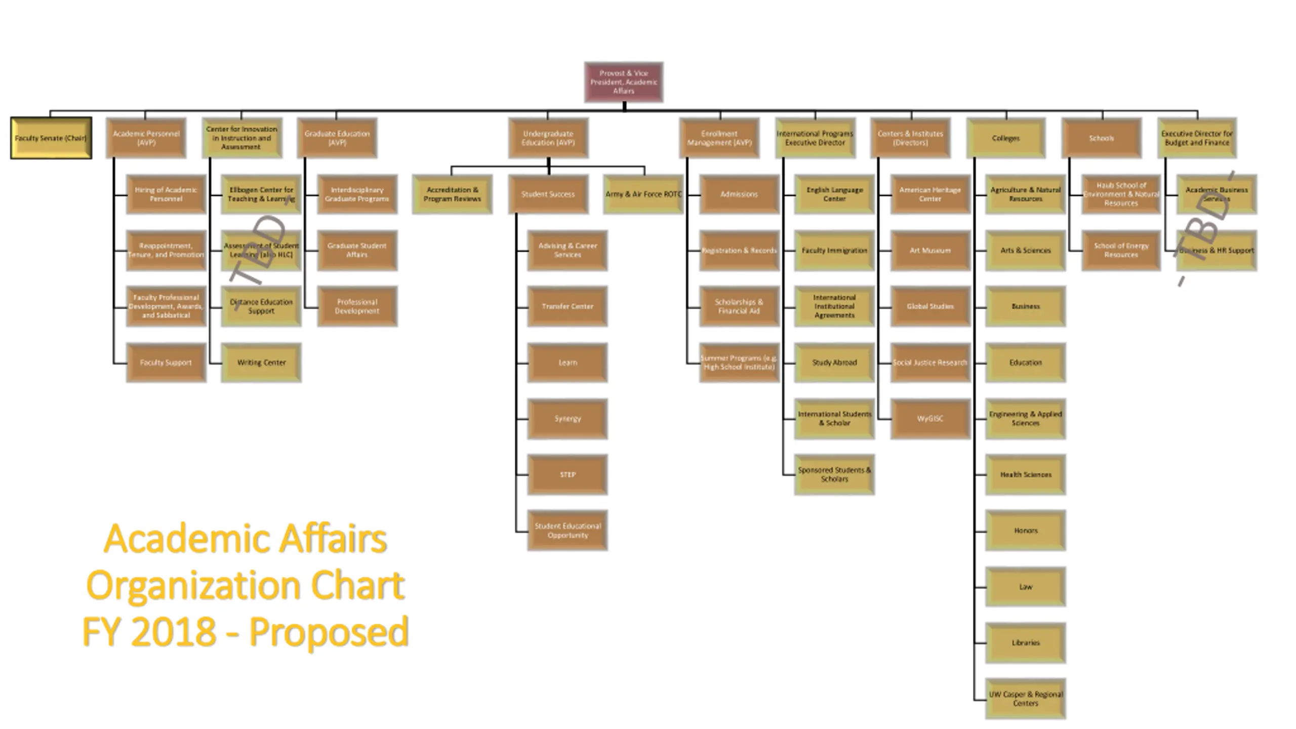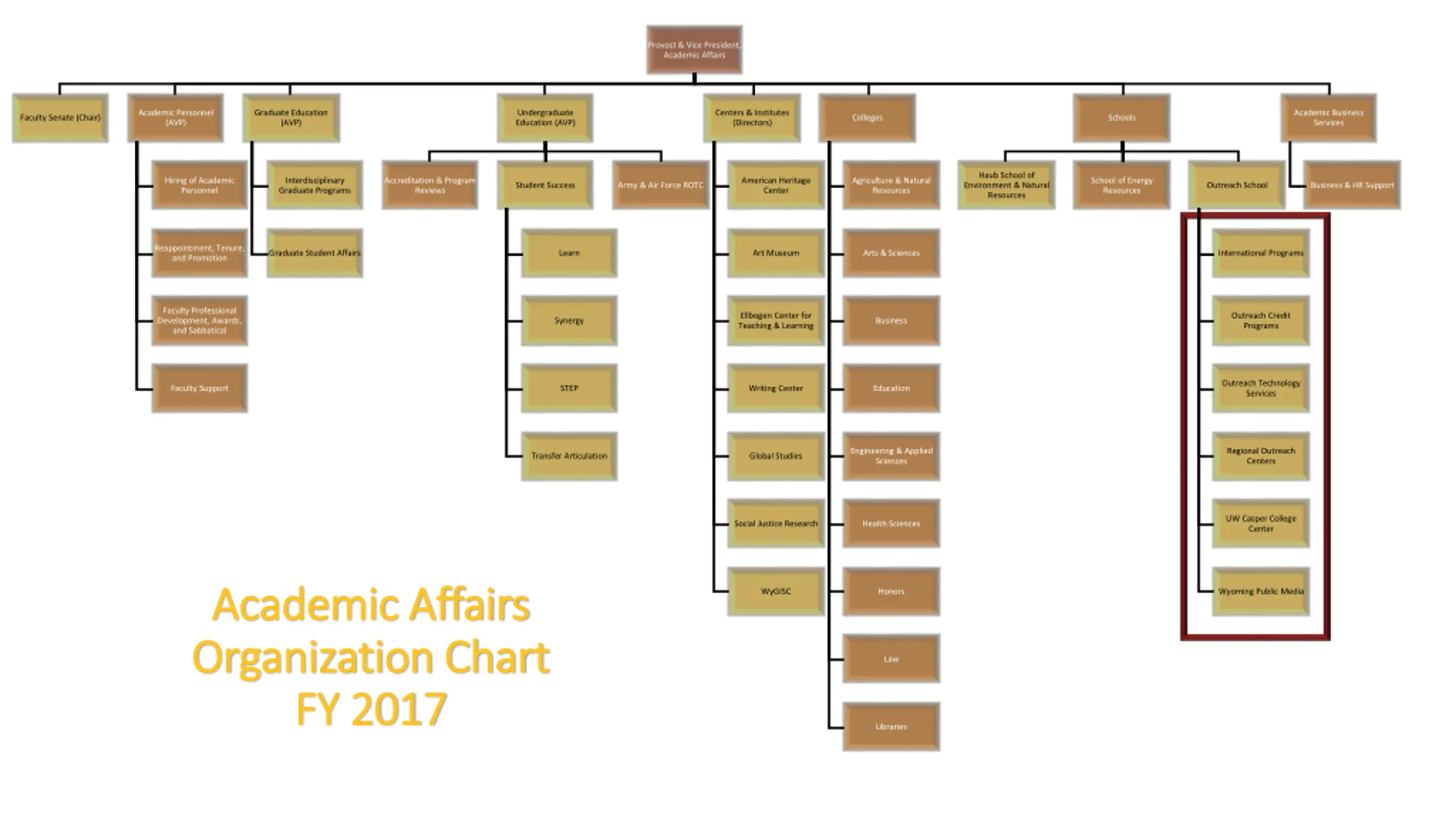 Provost & Vice President, Academic Affairs Academic Personnel (AVP) Graduate Education (AVP) Undergraduate Education (AVP) Centers & Institutes (Directors) Academic Business Services Faculty Senate (Chair) Colleges Schools Haub School of Environment & Natural Resources Hiring of Academic Personnel Interdisciplinary Graduate Programs Accreditation & Program Reviews American Heritage Center Agriculture & Natural Resources School of Energy Resources Student Success Army & Air Force ROTC Outreach School Business & HR Support Reappointment, Tenure, and Promotion Graduate Student Affairs Learn Art Museum Arts & Sciences International Programs Faculty Professional Development, Awards, and Sabbatical Ellbogen Center for Teaching & Learning Outreach Credit Programs Synergy Business Outreach Technology Services Faculty Support STEP Writing Center Education Engineering & Applied Sciences Regional Outreach Centers Transfer Articulation Global Studies UW Casper College Center Social Justice Research Health Sciences Academic Affairs Academic Affairs Organization Chart Organization Chart FY 2017 FY 2017 WyGISC Honors Wyoming Public Media Law Libraries