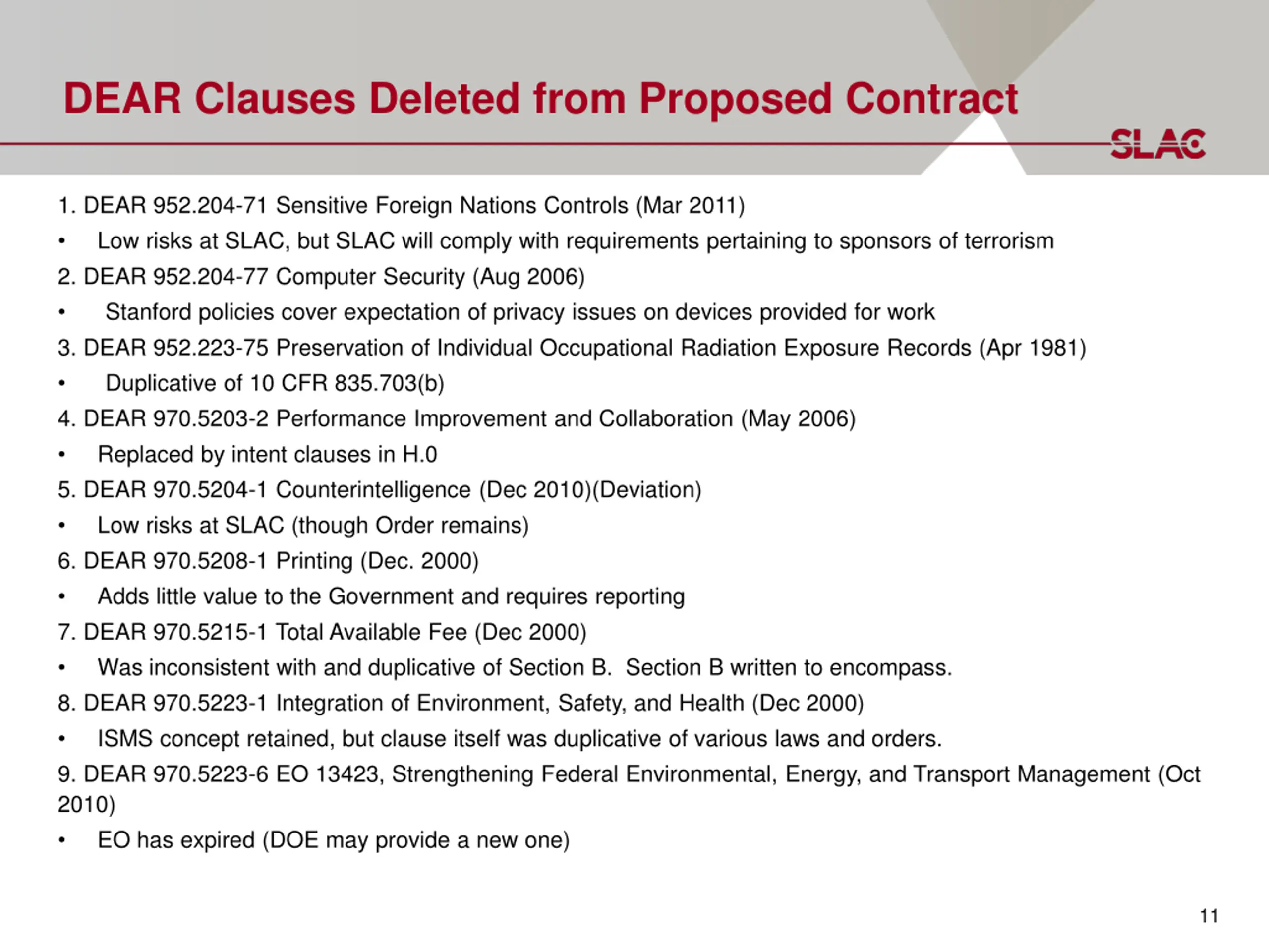 DEAR Clauses Deleted from Proposed Contract 1. DEAR 952.204-71 Sensitive Foreign Nations Controls (Mar 2011) Low risks at SLAC, but SLAC will comply with requirements pertaining to sponsors of terrorism 2. DEAR 952.204-77 Computer Security (Aug 2006) Stanford policies cover expectation of privacy issues on devices provided for work 3. DEAR 952.223-75 Preservation of Individual Occupational Radiation Exposure Records (Apr 1981) Duplicative of 10 CFR 835.703(b) 4. DEAR 970.5203-2 Performance Improvement and Collaboration (May 2006) Replaced by intent clauses in H.0 5. DEAR 970.5204-1 Counterintelligence (Dec 2010)(Deviation) Low risks at SLAC (though Order remains) 6. DEAR 970.5208-1 Printing (Dec. 2000) Adds little value to the Government and requires reporting 7. DEAR 970.5215-1 Total Available Fee (Dec 2000) Was inconsistent with and duplicative of Section B. Section B written to encompass. 8. DEAR 970.5223-1 Integration of Environment, Safety, and Health (Dec 2000) ISMS concept retained, but clause itself was duplicative of various laws and orders. 9. DEAR 970.5223-6 EO 13423, Strengthening Federal Environmental, Energy, and Transport Management (Oct 2010) EO has expired (DOE may provide a new one) 11