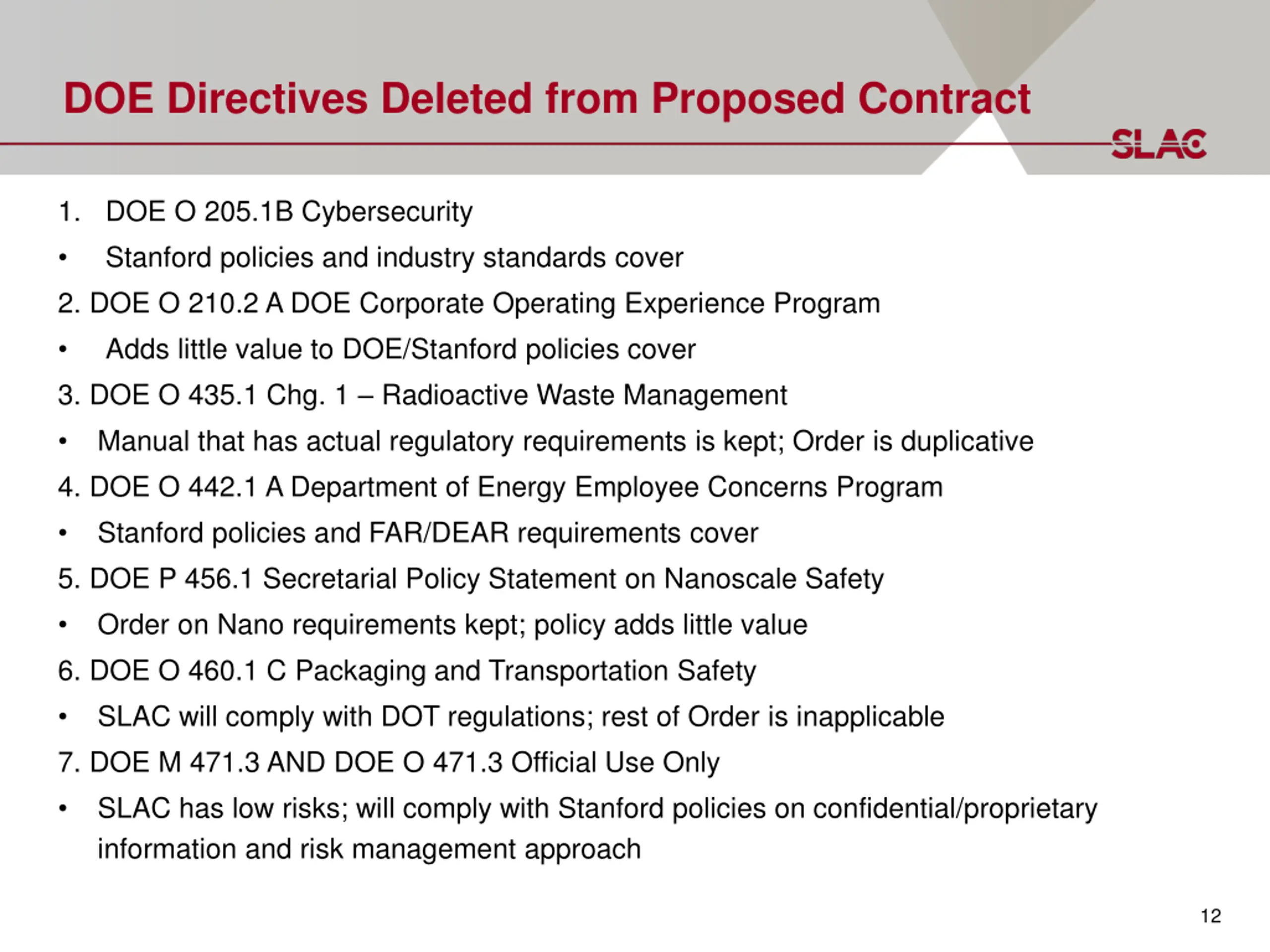 DOE Directives Deleted from Proposed Contract 1. DOE O 205.1B Cybersecurity Stanford policies and industry standards cover 2. DOE O 210.2 A DOE Corporate Operating Experience Program Adds little value to DOE/Stanford policies cover 3. DOE O 435.1 Chg. 1 Radioactive Waste Management Manual that has actual regulatory requirements is kept; Order is duplicative 4. DOE O 442.1 A Department of Energy Employee Concerns Program Stanford policies and FAR/DEAR requirements cover 5. DOE P 456.1 Secretarial Policy Statement on Nanoscale Safety Order on Nano requirements kept; policy adds little value 6. DOE O 460.1 C Packaging and Transportation Safety SLAC will comply with DOT regulations; rest of Order is inapplicable 7. DOE M 471.3 AND DOE O 471.3 Official Use Only SLAC has low risks; will comply with Stanford policies on confidential/proprietary information and risk management approach 12