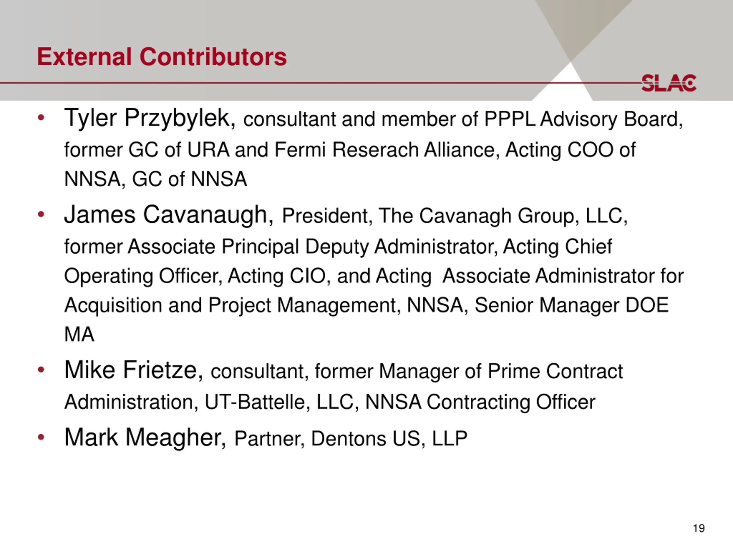 External Contributors Tyler Przybylek, consultant and member of PPPL Advisory Board, former GC of URA and Fermi Reserach Alliance, Acting COO of NNSA, GC of NNSA James Cavanaugh, President, The Cavanagh Group, LLC, former Associate Principal Deputy Administrator, Acting Chief Operating Officer, Acting CIO, and Acting Associate Administrator for Acquisition and Project Management, NNSA, Senior Manager DOE MA Mike Frietze, consultant, former Manager of Prime Contract Administration, UT-Battelle, LLC, NNSA Contracting Officer Mark Meagher, Partner, Dentons US, LLP 19