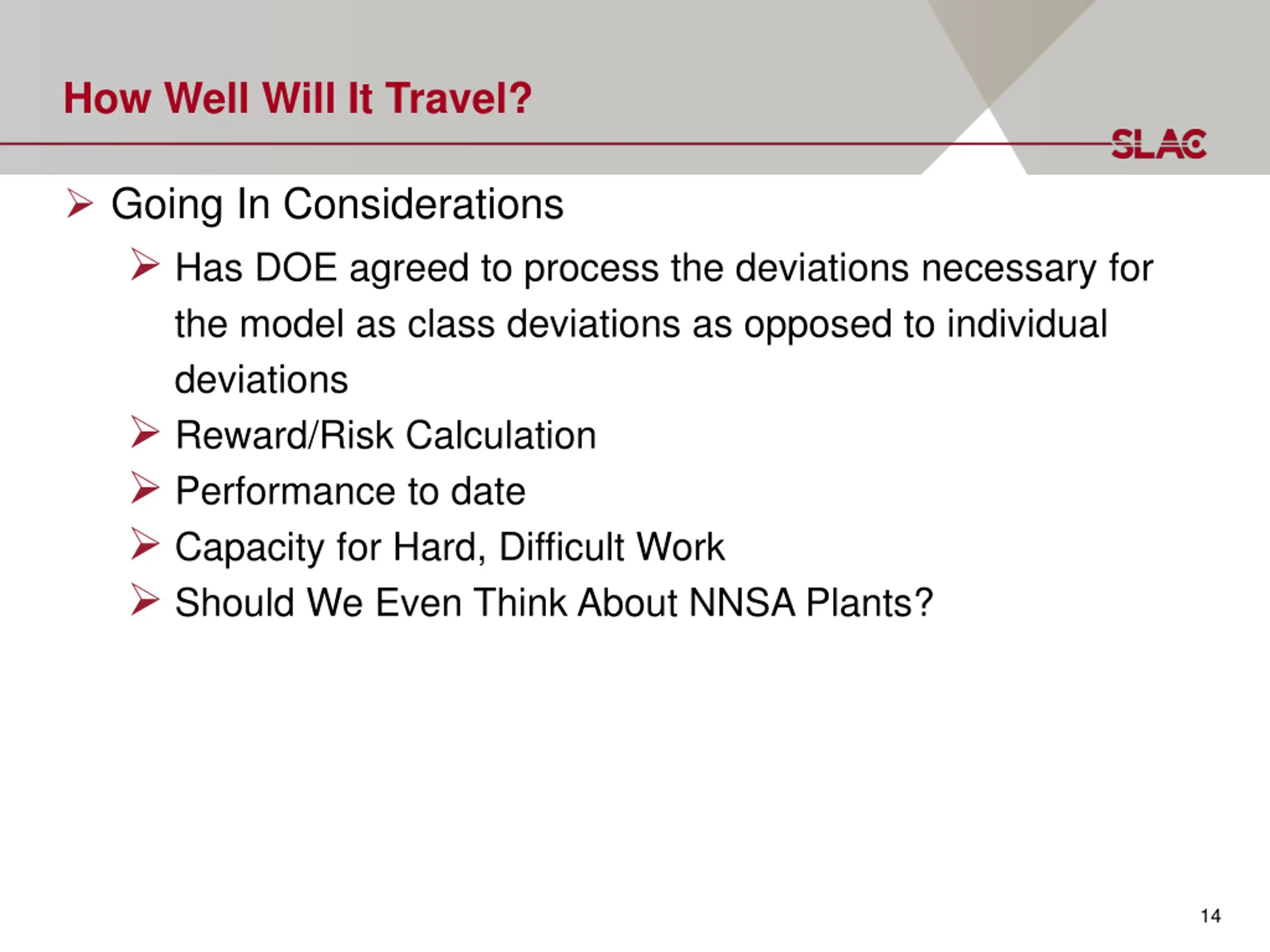 How Well Will It Travel? Going In Considerations Has DOE agreed to process the deviations necessary for the model as class deviations as opposed to individual deviations Reward/Risk Calculation Performance to date Capacity for Hard, Difficult Work Should We Even Think About NNSA Plants? 14