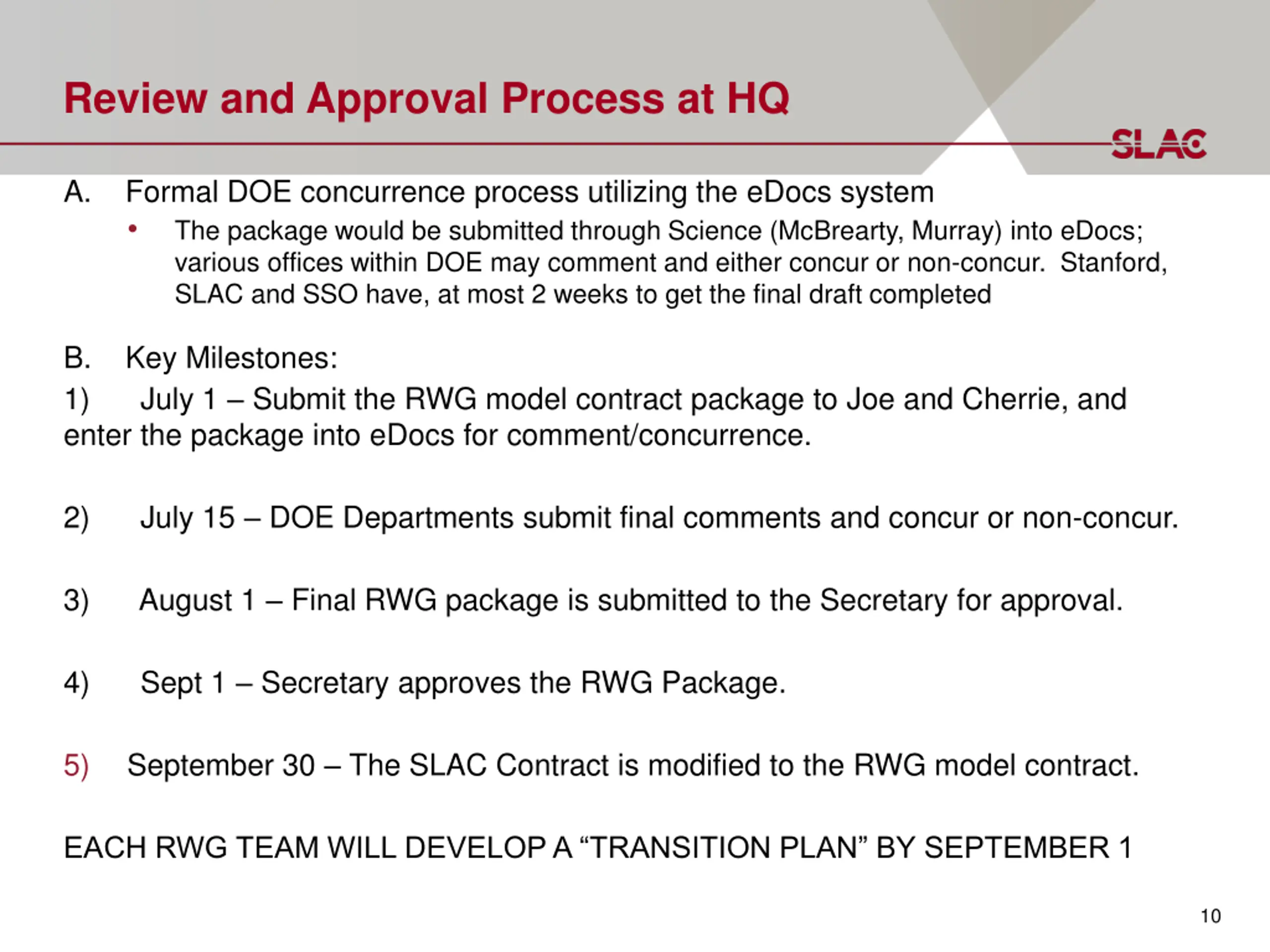Review and Approval Process at HQ A. Formal DOE concurrence process utilizing the eDocs system The package would be submitted through Science (McBrearty, Murray) into eDocs; various offices within DOE may comment and either concur or non-concur. Stanford, SLAC and SSO have, at most 2 weeks to get the final draft completed B. Key Milestones: 1) July 1 Submit the RWG model contract package to Joe and Cherrie, and enter the package into eDocs for comment/concurrence. 2) July 15 DOE Departments submit final comments and concur or non-concur. 3) August 1 Final RWG package is submitted to the Secretary for approval. 4) Sept 1 Secretary approves the RWG Package. 5) September 30 The SLAC Contract is modified to the RWG model contract. EACH RWG TEAM WILL DEVELOP A TRANSITION PLAN BY SEPTEMBER 1 10