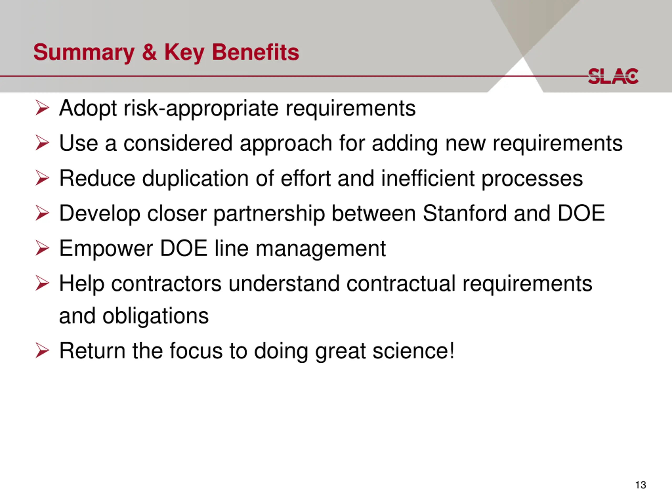 Summary & Key Benefits Adopt risk-appropriate requirements Use a considered approach for adding new requirements Reduce duplication of effort and inefficient processes Develop closer partnership between Stanford and DOE Empower DOE line management Help contractors understand contractual requirements and obligations Return the focus to doing great science! 13