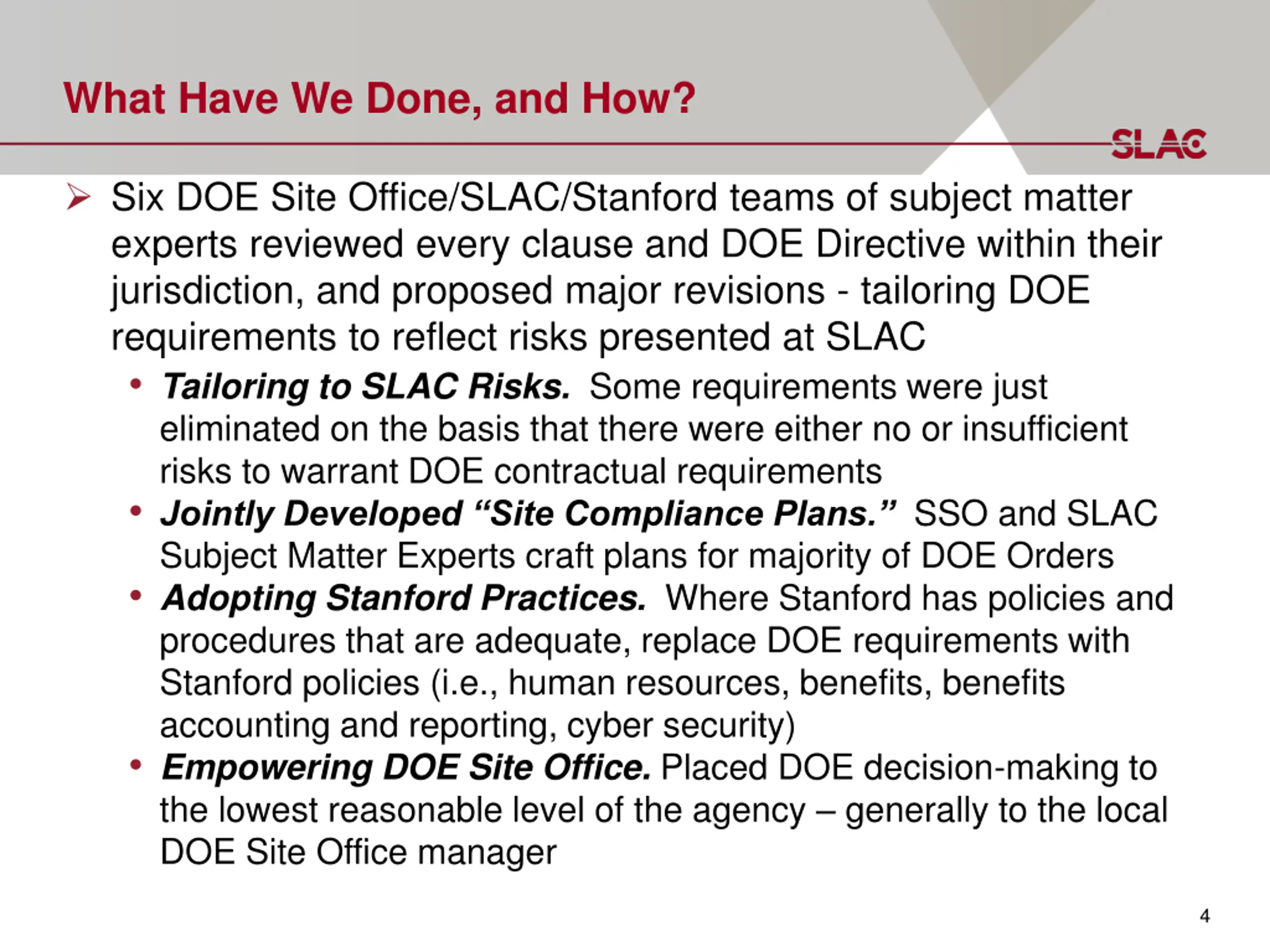 Investigated Moving to a Cooperative Agreement (CA) Financial Assistance Agreement used by NSF for Labs Consideration Would the lab still be considered a 1) FFRDC? 2) National lab? 3) Federal facility pre-emption from local zoning/regulation? 4) Letter of credit or advanced funding? Finding 1 CA could be used for FFRDC 2 CA could be used for National Lab 3 No change under CA 4 Works well for M&O Contract, other alternatives available under CA CA does not offer flexibility needed Authority is not clear under CA Would DOE still invest in facilities? Would we be able to do work for others ? Indemnification under Price Anderson Amendments Act (low risk for Stanford, but high consequence) Available only to Contractors, not financial assistance recipients - CA Stanford and DOE determined M&O contract is best 3