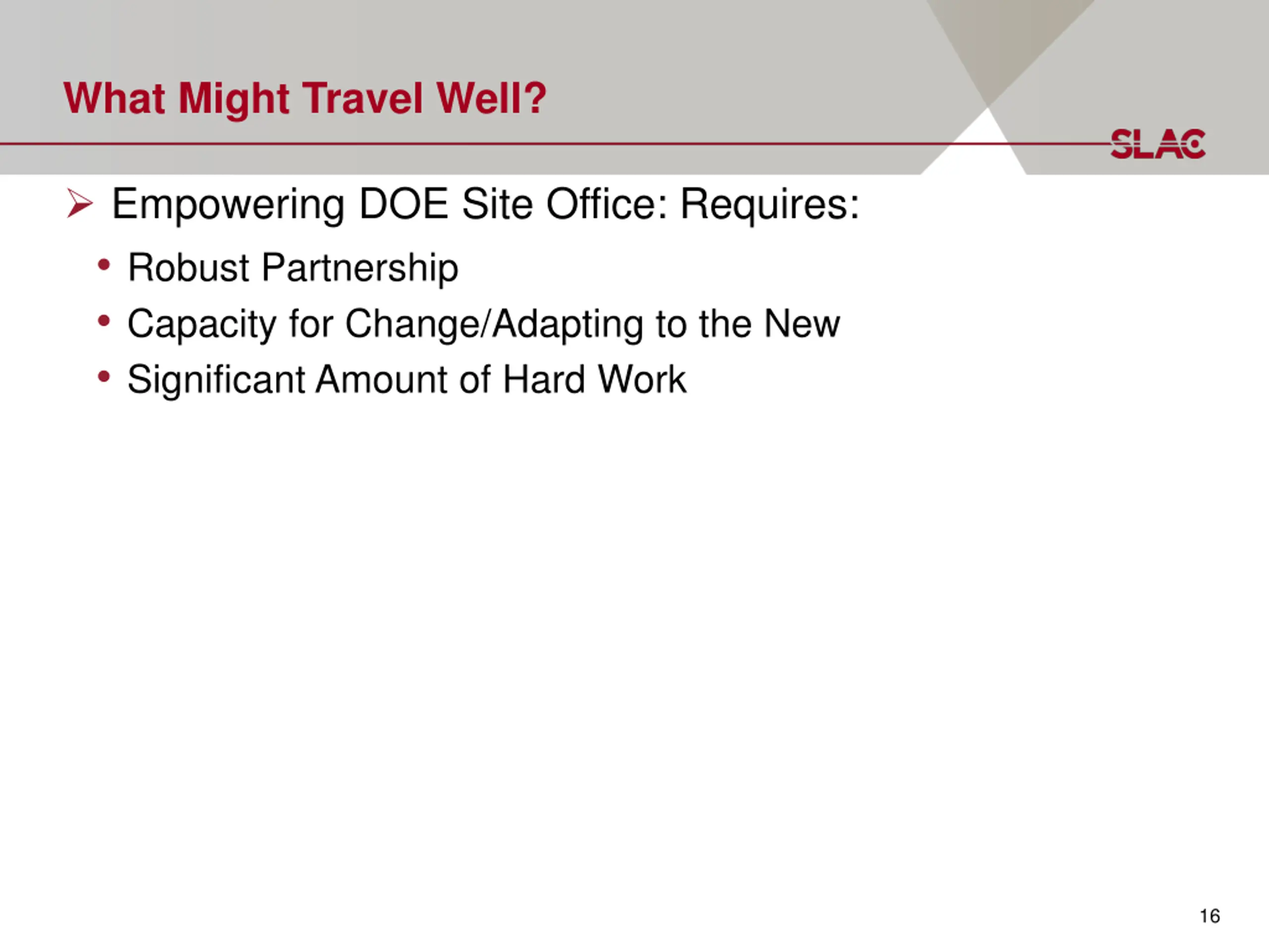 What Might Travel Well? Empowering DOE Site Office: Requires: Robust Partnership Capacity for Change/Adapting to the New Significant Amount of Hard Work 16