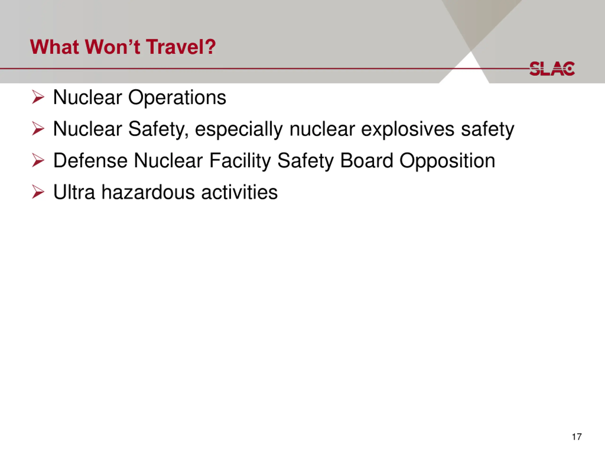 What Wont Travel? Nuclear Operations Nuclear Safety, especially nuclear explosives safety Defense Nuclear Facility Safety Board Opposition Ultra hazardous activities 17