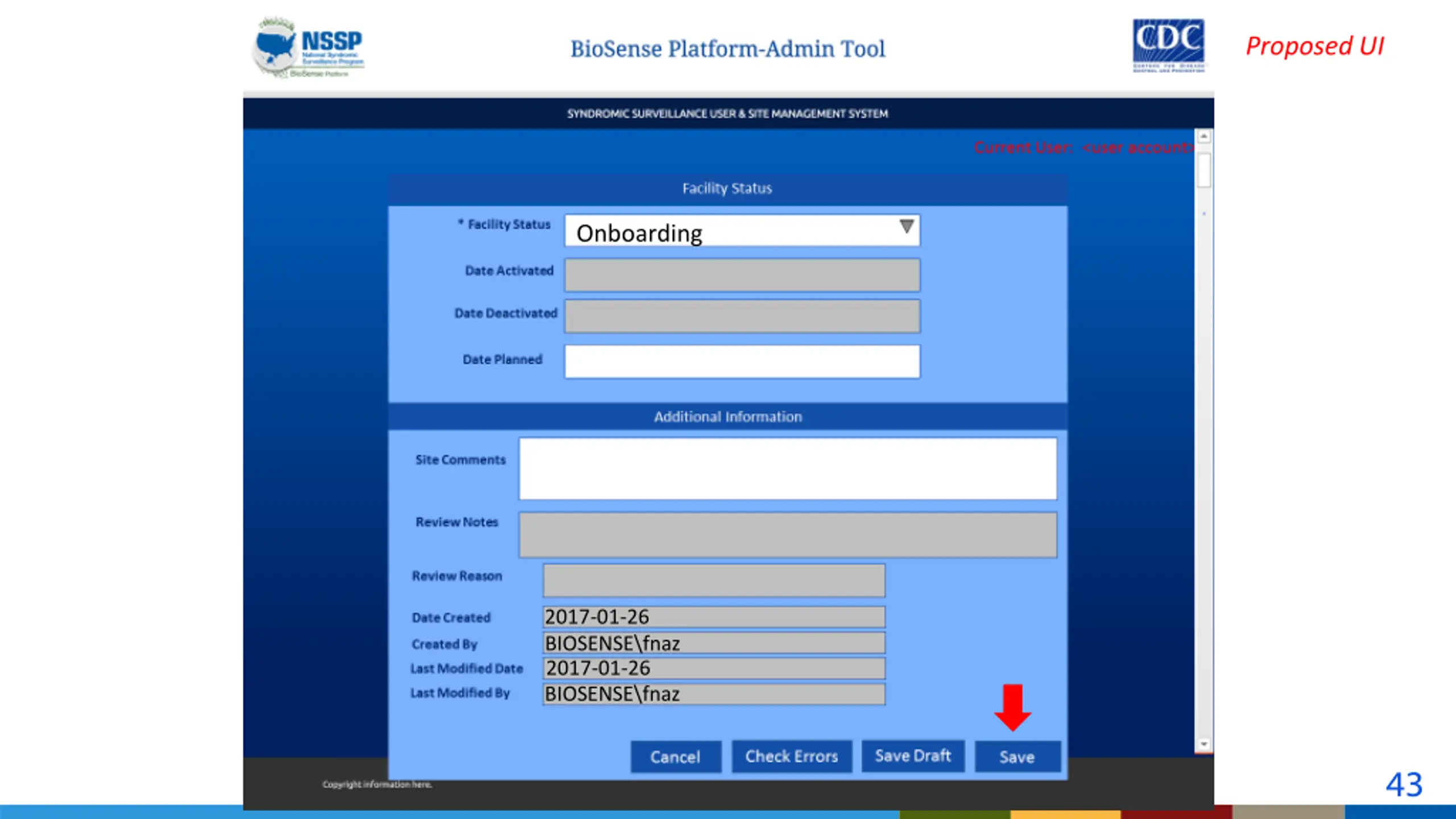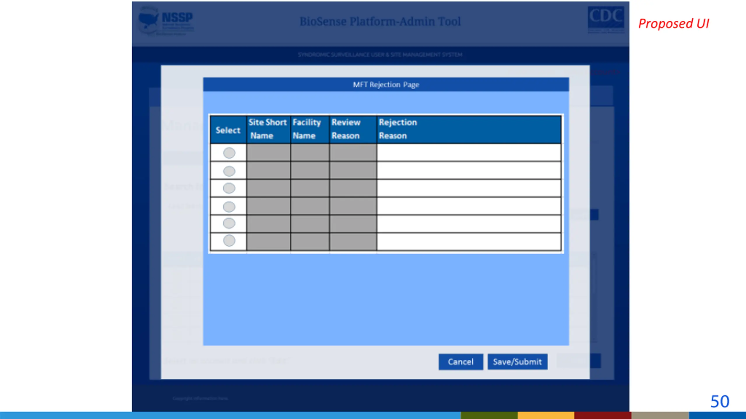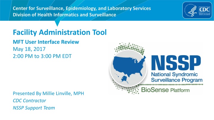 Proposed UI Center for Surveillance, Epidemiology, and Laboratory Services Division of Health Informatics and Surveillance Facility Administration Tool MFT User Interface Review May 18, 2017 2:00 PM to 3:00 PM EDT Presented By Millie Linville, MPH CDC Contractor NSSP Support Team