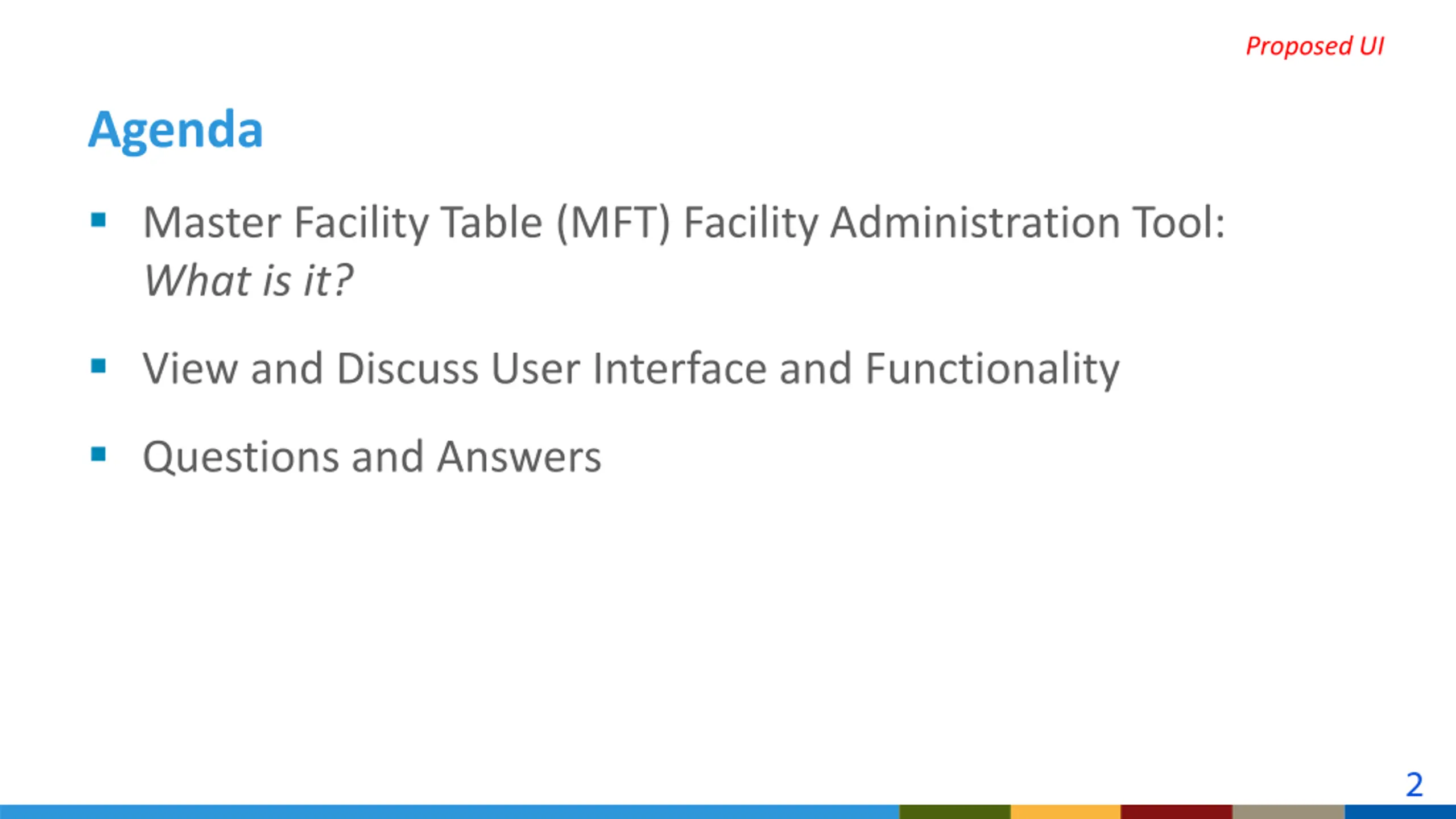 Proposed UI Agenda Master Facility Table (MFT) Facility Administration Tool: What is it? View and Discuss User Interface and Functionality Questions and Answers 2